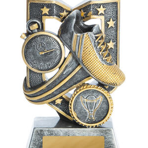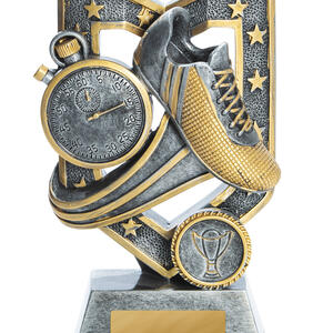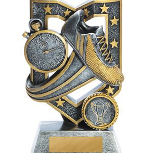 The Aegis Series athletics trophy presents a refined recognition piece for track, field, and running events. Crafted with a metallic silver and gold finish, it features a stopwatch, running shoe, and trophy emblem; iconic symbols of athletic performance. This trophy is a durable, classic design suitable for all levels of competition.
