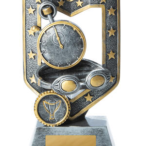 This contemporary swimming trophy combines a striking silver and gold finish with a detailed stopwatch and goggles motif, capturing the essence of competitive swimming. Crafted from quality resin, its trophy like silhouette is accented by a distinguished emblem, creating a memorable symbol of achievement. An ideal choice for sports clubs and schools seeking swimming trophies that deliver both elegance and durability.