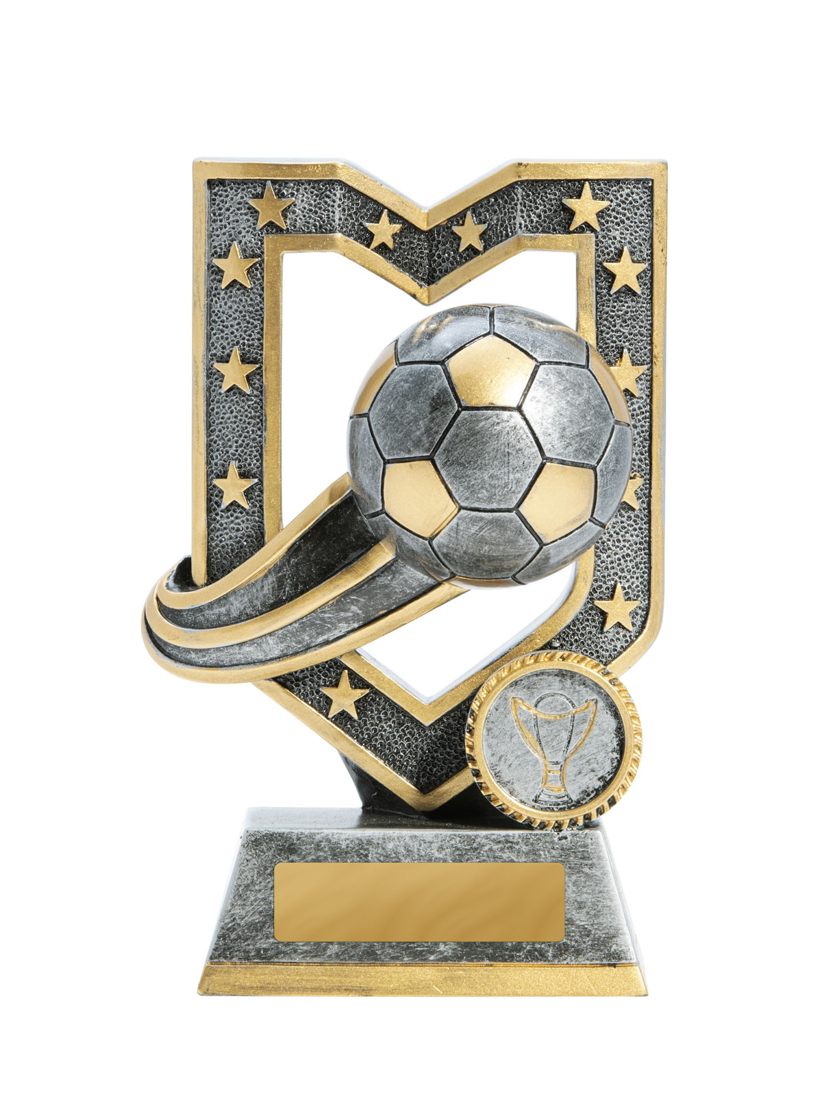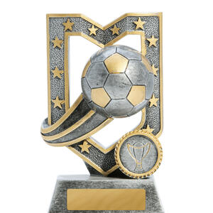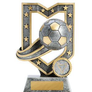 This distinguished piece stands out among soccer trophies, featuring a gold crown like motif surrounding a sculpted soccer ball at its apex. Crafted from plastic, this award offers customisation with engraving, making it a memorable choice for recognising soccer excellence.