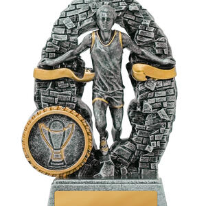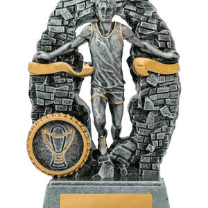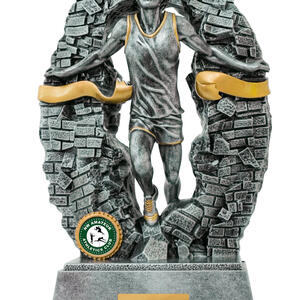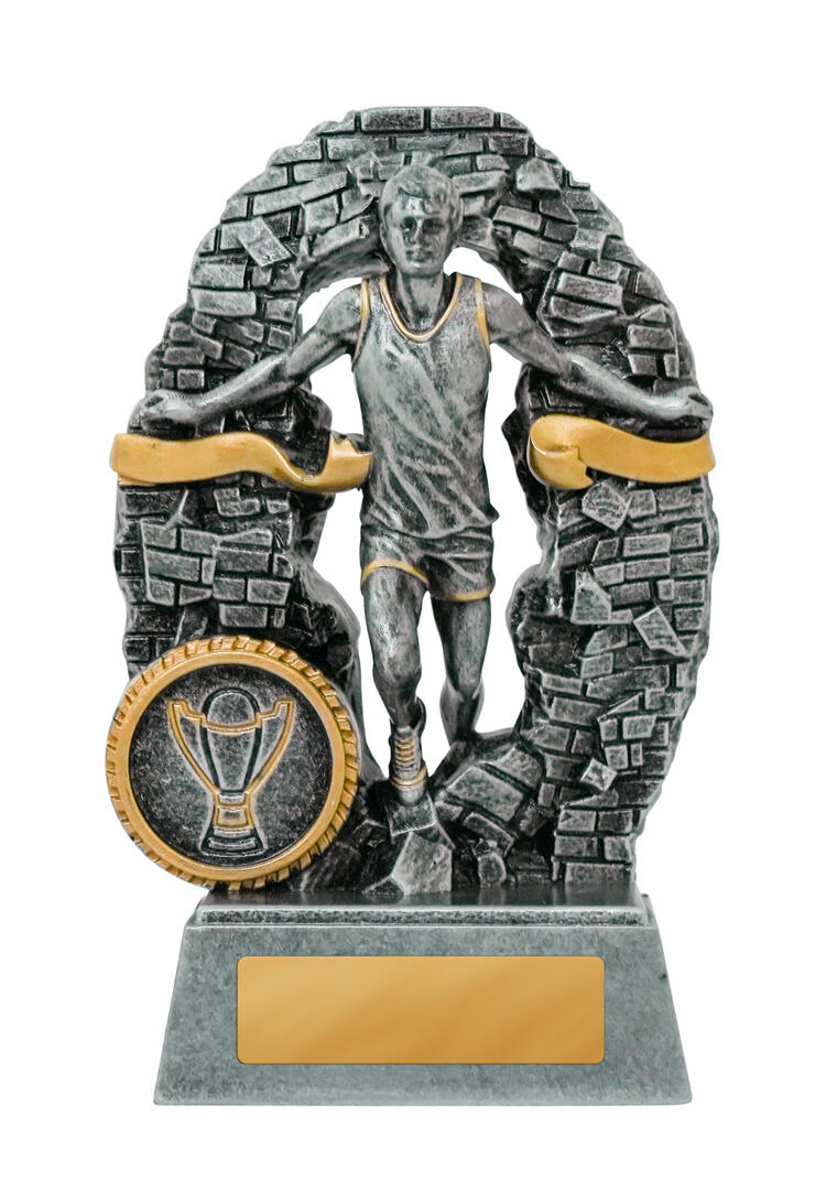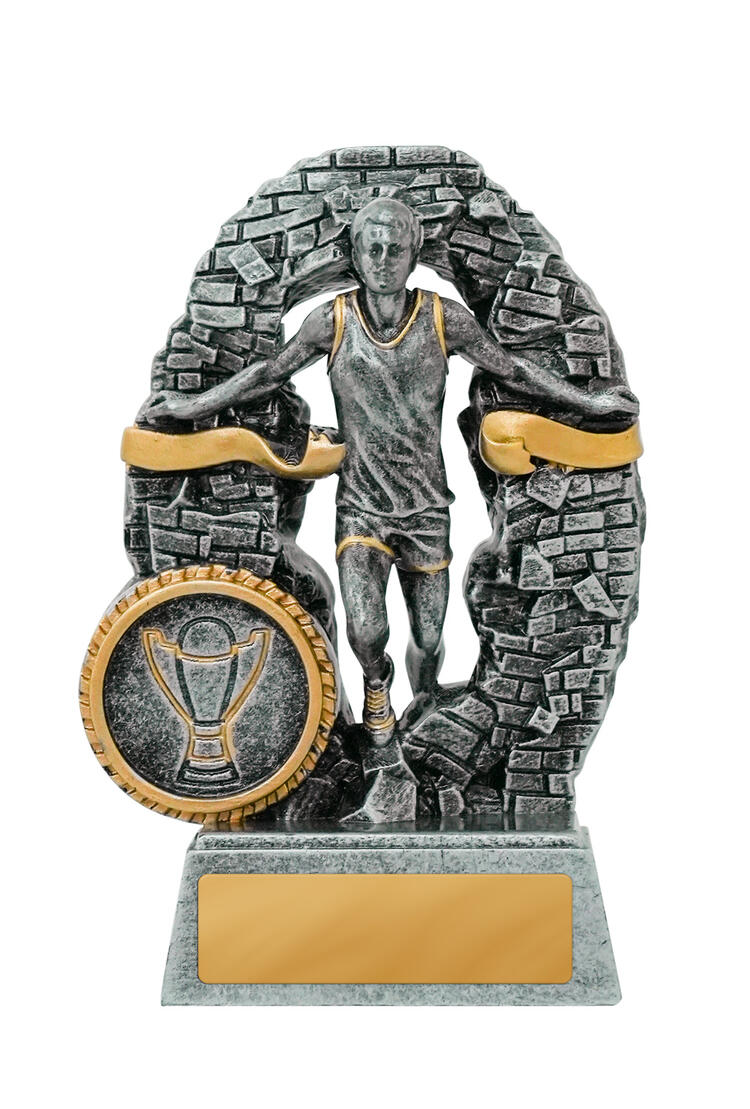 This athletics trophy presents a dynamic male runner breaking through a wall and ribbon, capturing the spirit of determination and achievement. The blend of silver and gold finishes highlights the carefully crafted details, while the sturdy metal or resin construction ensures lasting quality. Featuring a circular trophy emblem and a base ready for personalisation, it is an elegant choice for recognising excellence in running and athletics.