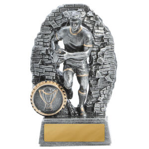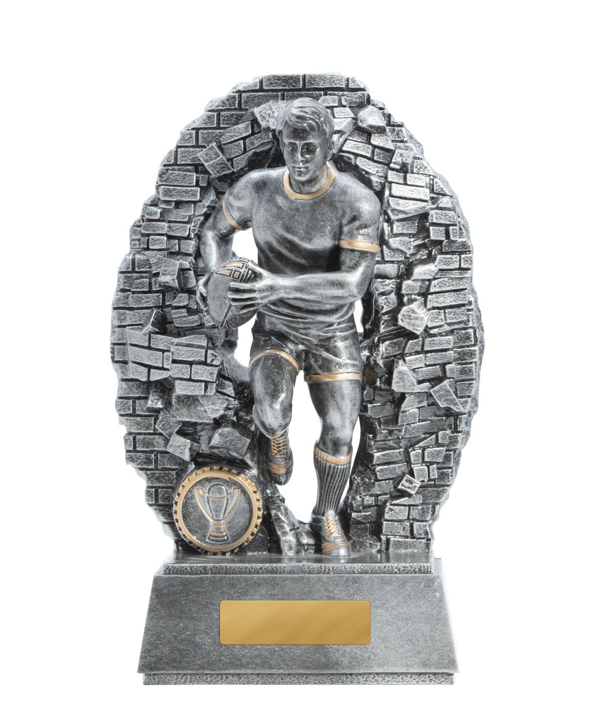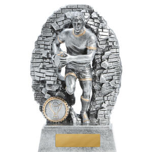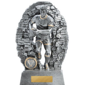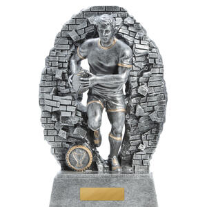 This striking award captures the spirit of rugby with a dynamic male player breaking through a wall, presented in a sophisticated blend of silver and gold tones. Crafted from resin and set on an oval base, it features a 25mm centre emblem ready for customisation.