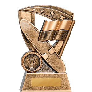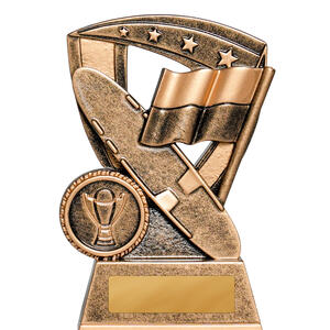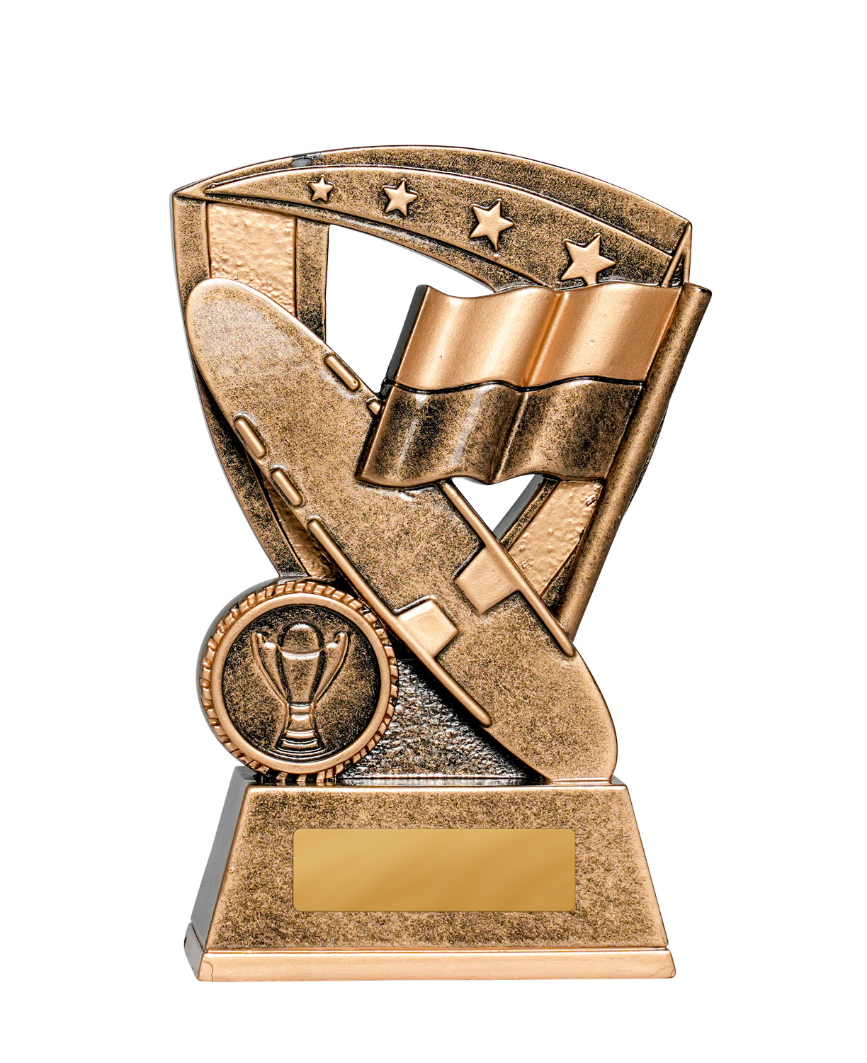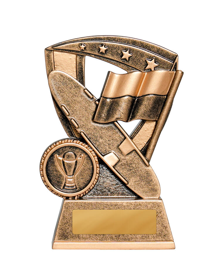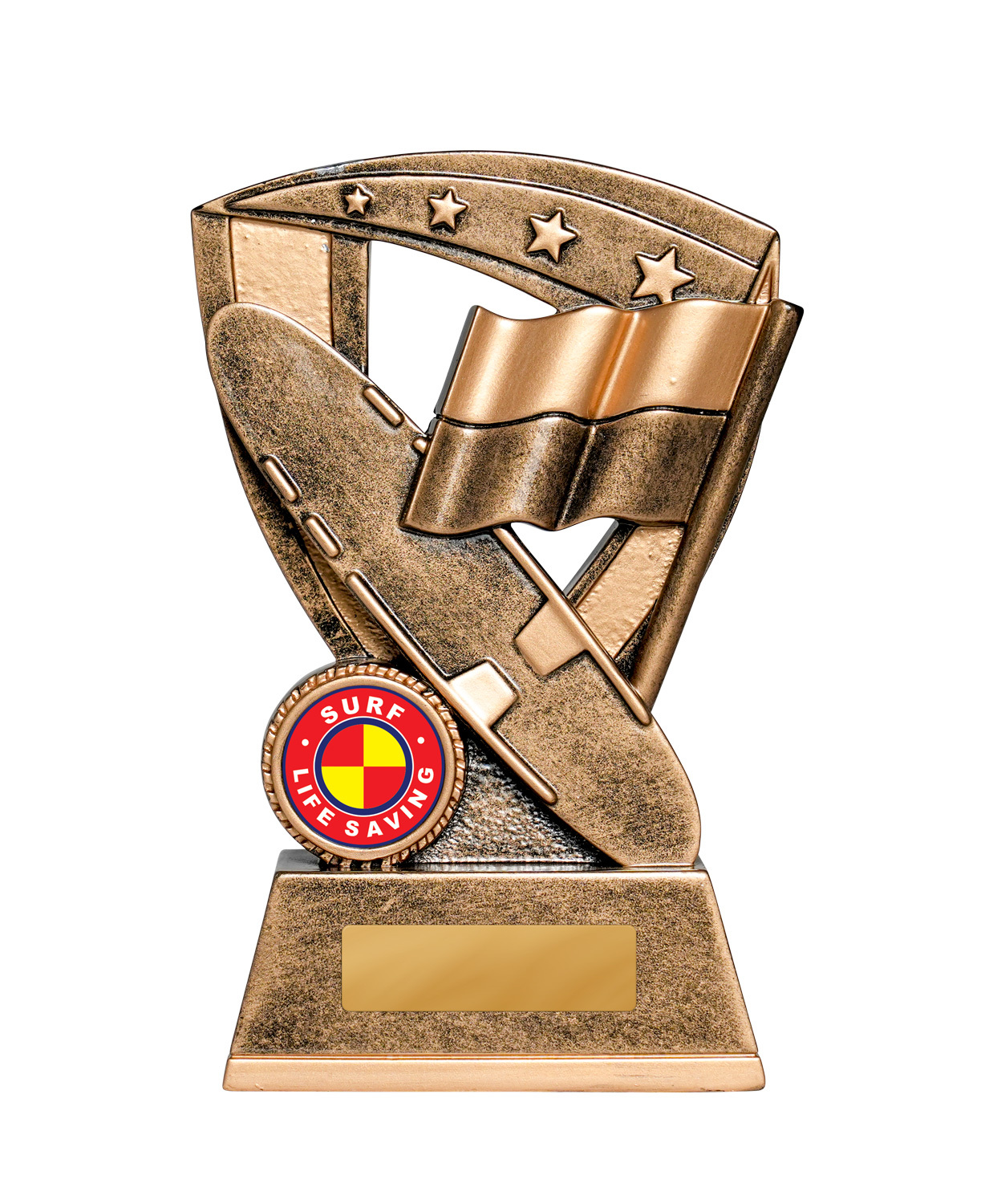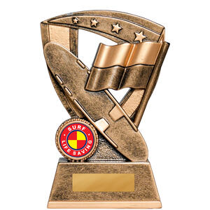 This bronze star shield trophy represents surf life saving with signature elements - board, reel, and flag - overlaid on a detailed star background. The antique bronze finish offers a classic look suited to club and regional awards.