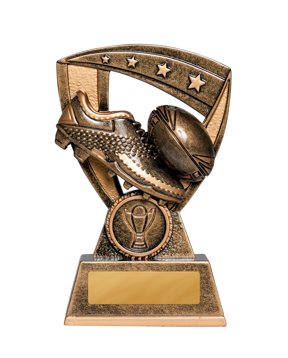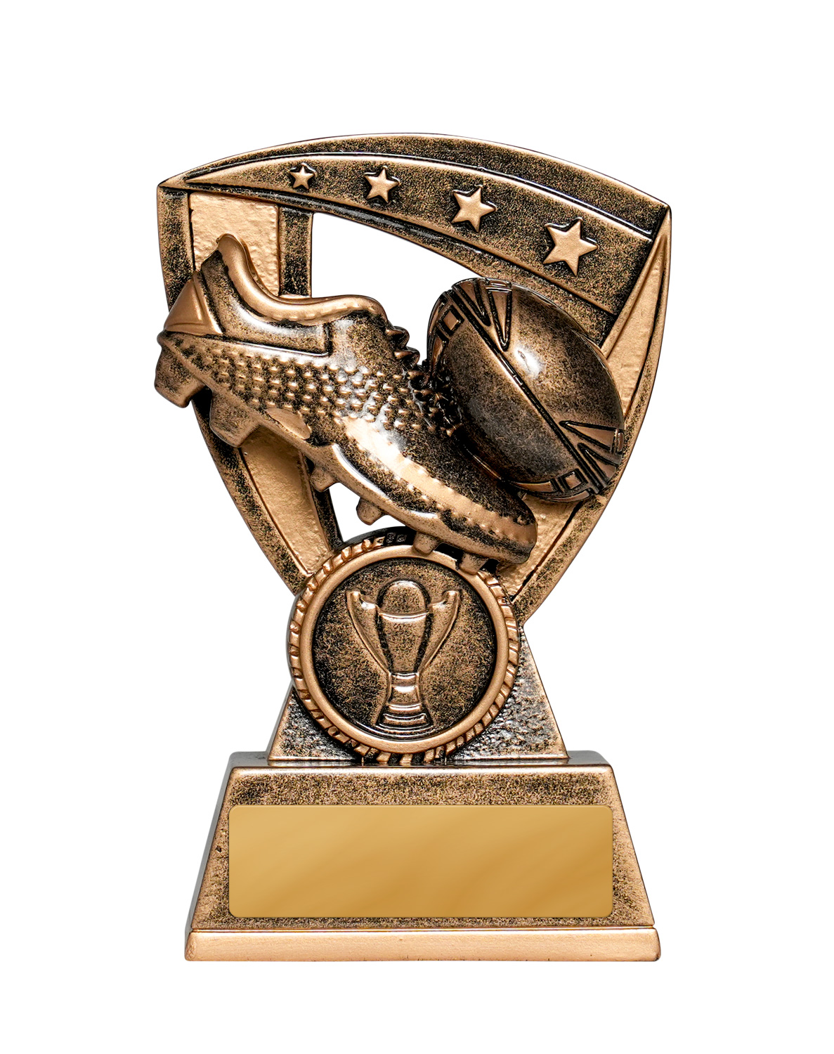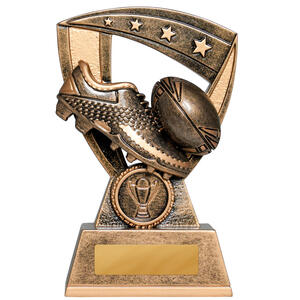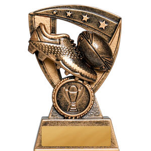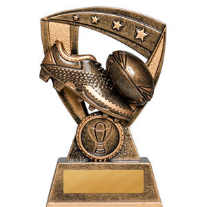 This shield inspired rugby league and rugby union trophy features a robust metallic finish. The design captures the essence of the game with a prominent rugby ball and shoe, set against a bold shield silhouette.