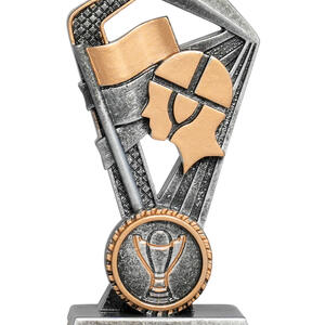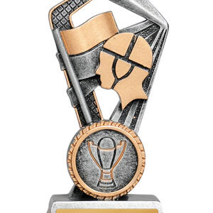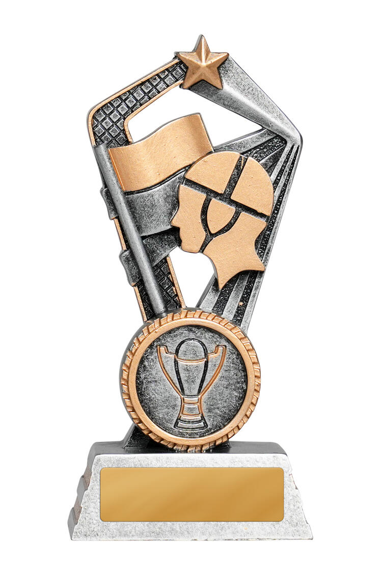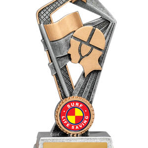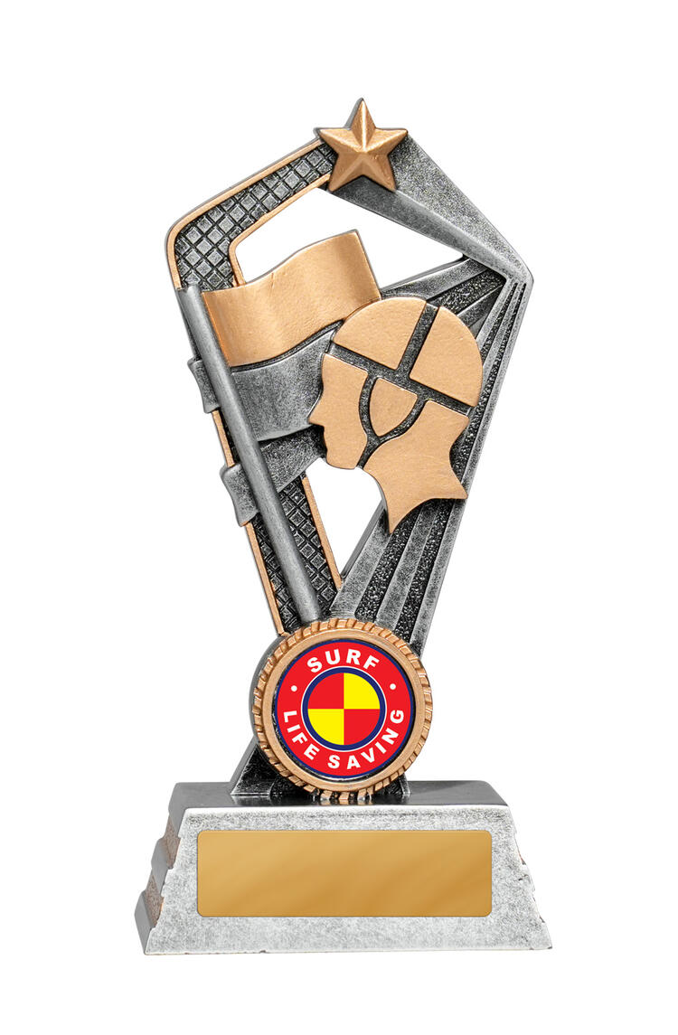 This Surf Life Saving trophy features a modern silver and gold resin design highlighting the signature elements of the sport - the surf cap, rescue flag, and star emblem. A bold and durable award, perfect for recognising achievement, dedication, and team spirit in surf life saving events and competitions.