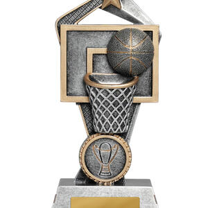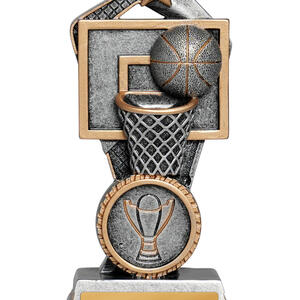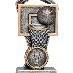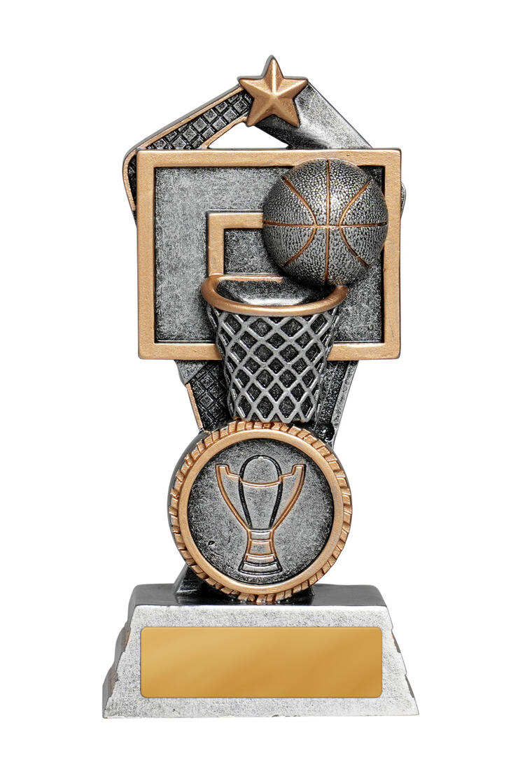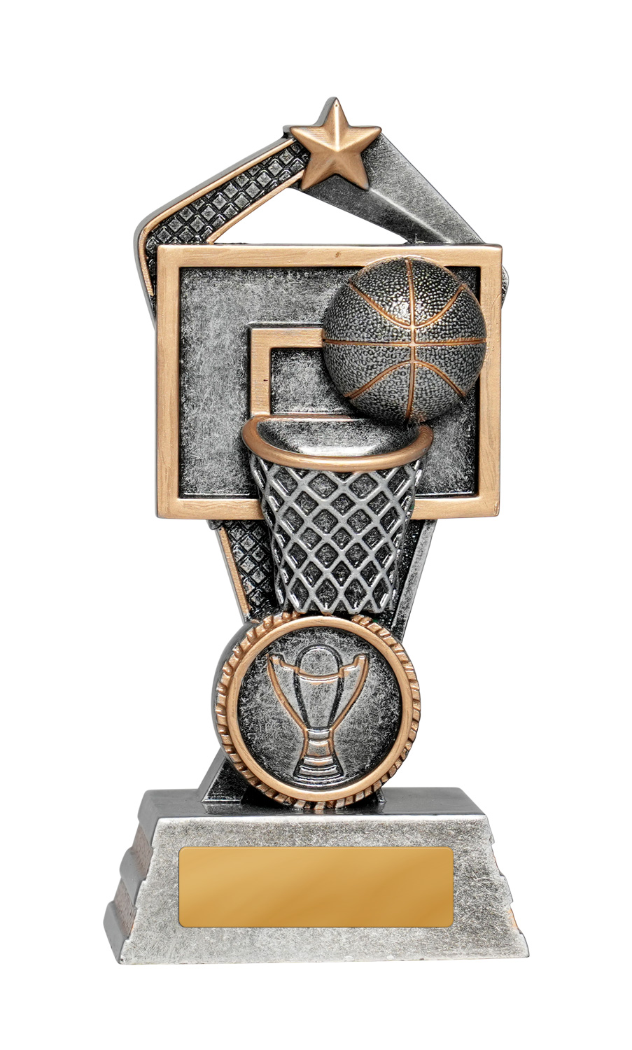 This Santorini Series basketball trophy is crafted for memorable basketball awards, featuring a dynamic design with a basketball and hoop framed by an elegant star. The silver and gold finish, in high quality resin, provides both durability and style.