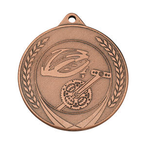 This 50mm cycling medal is crafted from metal and finished in your choice of gold, silver, or bronze. Its circular design features a detailed bicycle helmet and crankset, making it a fitting tribute for cycling competitions and events.