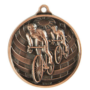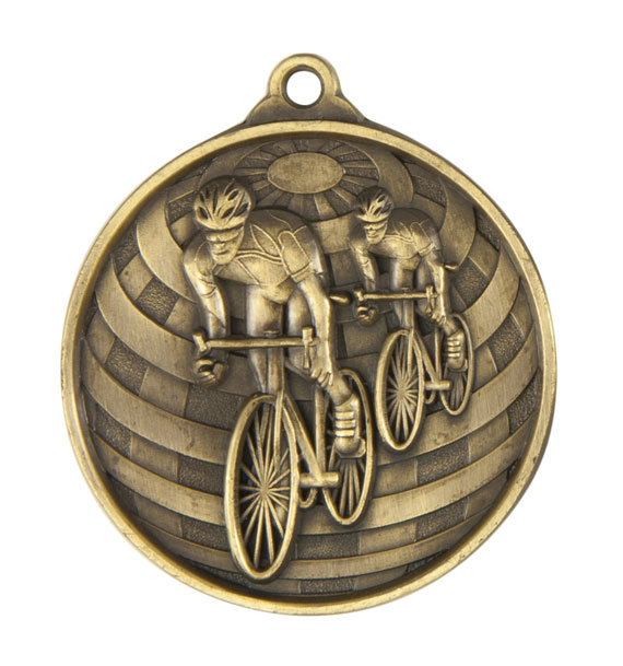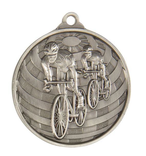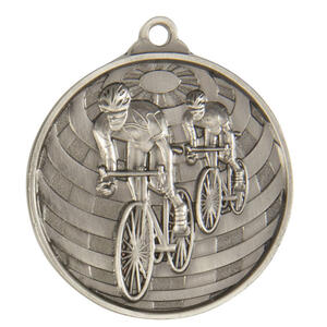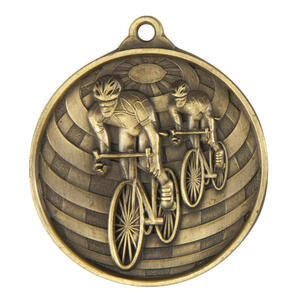 This cycling medal combines quality and style in a 50mm circular design, offering a memorable way to recognise achievement. Available in gold, silver, and bronze finishes, it features two cyclists in motion on a textured background. With a classic loop for easy ribbon attachment, it's an ideal choice for cycling medals at sports events and competitions.