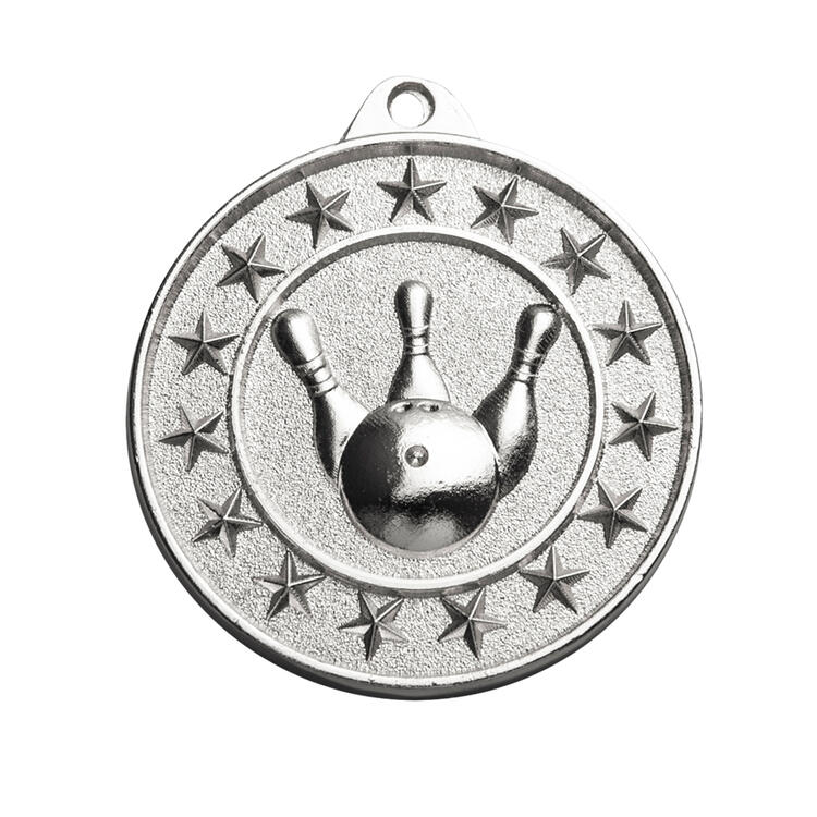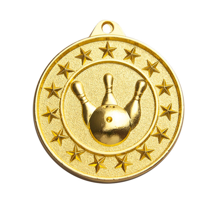 Crafted for distinction, this circular medal showcases a detailed tenpin bowling ball and pins design, bordered by embossed stars for a refined celebratory finish. Available in gold, silver, and bronze, it offers a classic way to honour achievement in tenpin bowling. A standout choice for tenpin medals, its durable build and elegant look suit competitions of any scale.