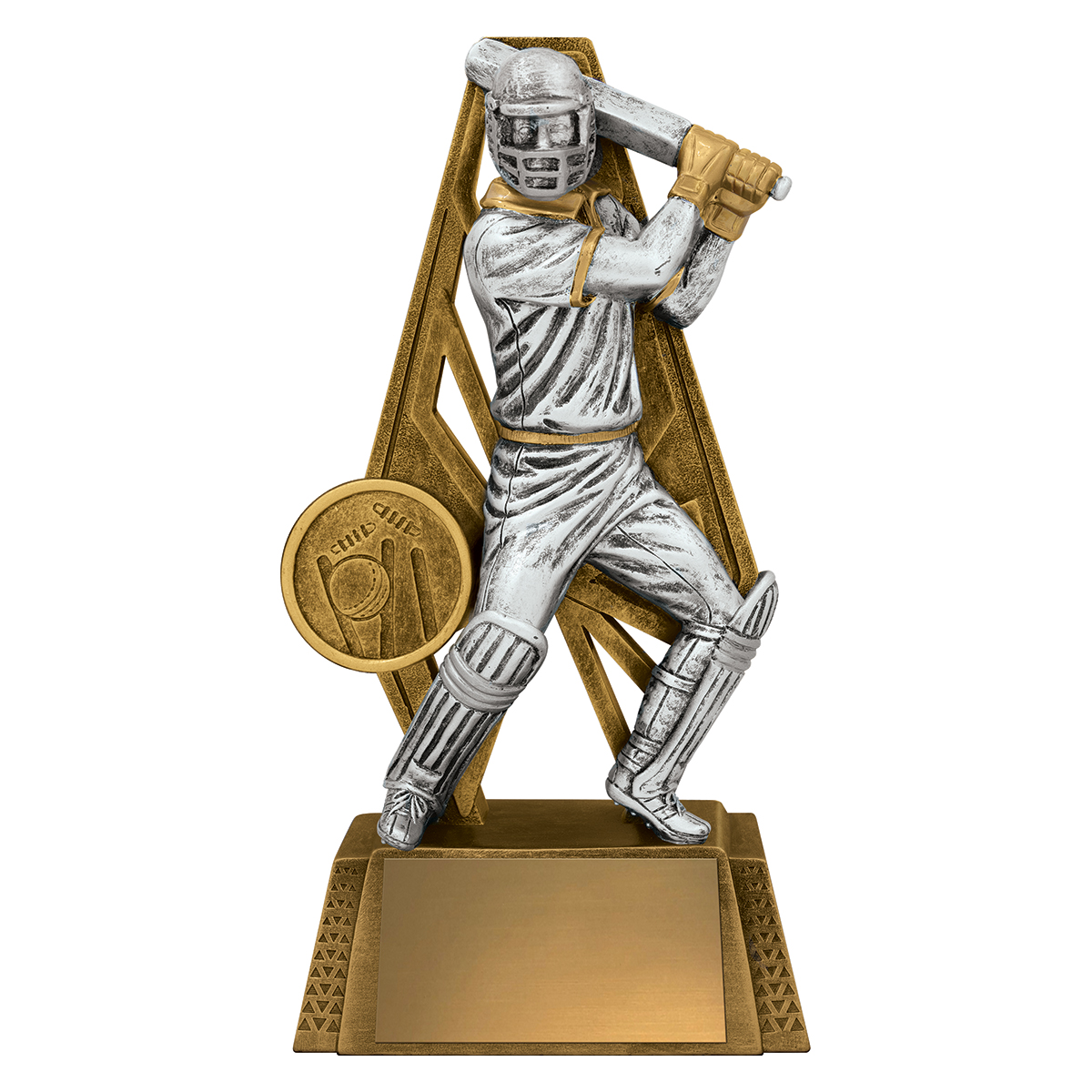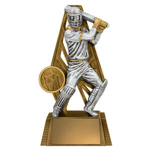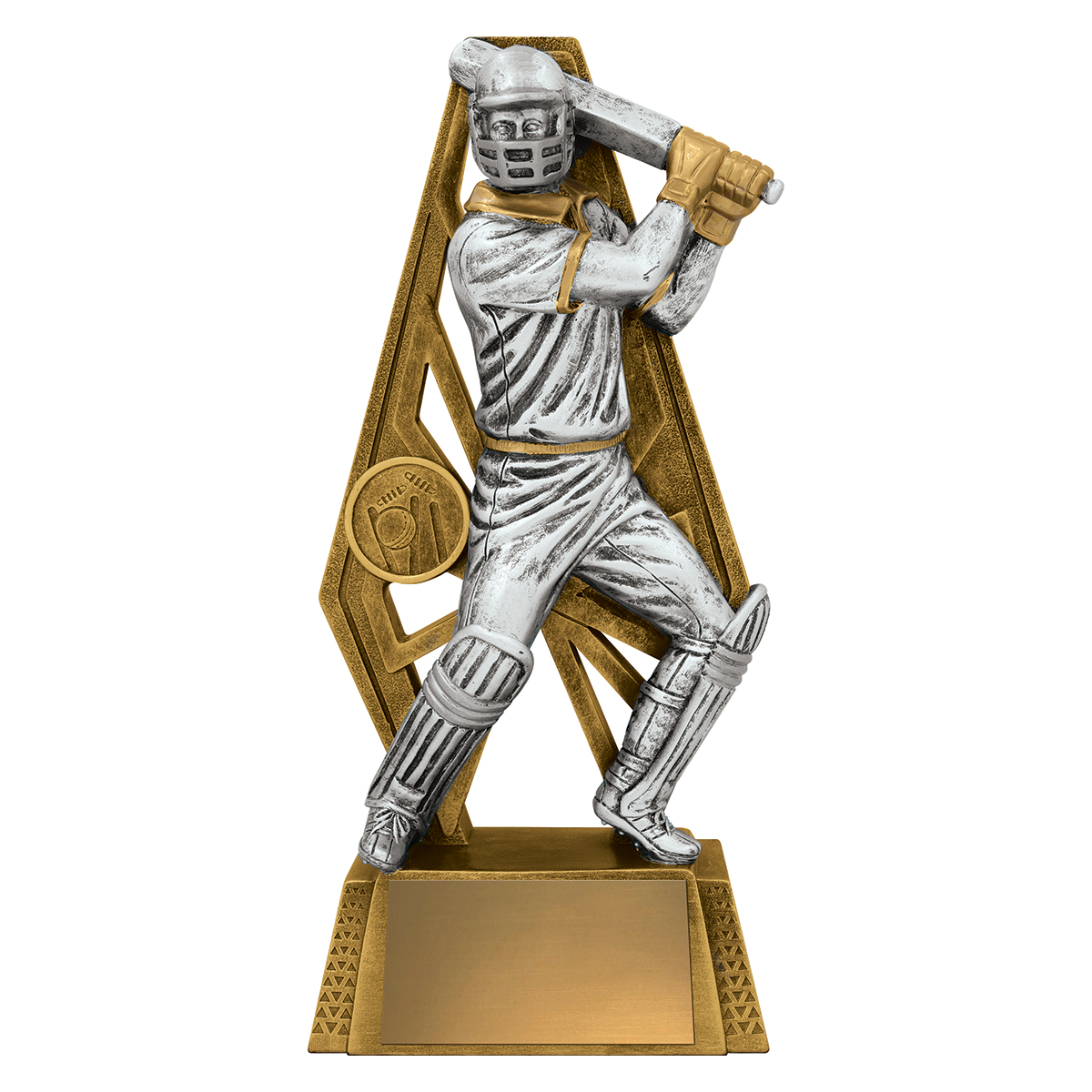 A powerful batting cricket trophy featuring a detailed silver batter poised to strike, supported by a bold gold geometric frame. Includes a circular area suitable for a custom logo insert, perfect for recognising batting excellence.