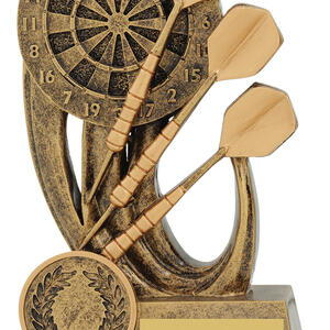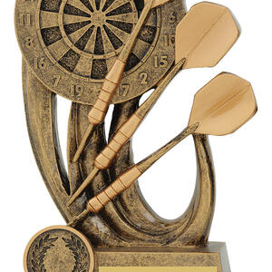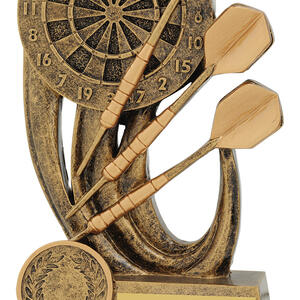 Celebrate darts achievement with this expertly crafted darts trophy, distinguished by its gold metallic finish. The design features a prominent dartboard, three finely detailed darts, and a laurel wreath emblem, capturing the spirit of precision and competition. Durable resin ensures longevity, while a classic silhouette create a professional, memorable award for standout performance.