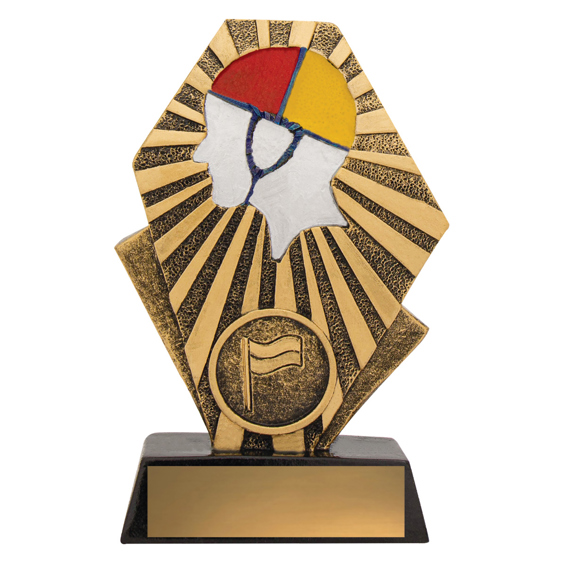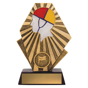 This radiant surf life saving trophy features a coloured cap silhouette set against gold rayburst detailing. Crafted from durable resin, its a vibrant and distinctive award ideal for recognising surf club achievements.