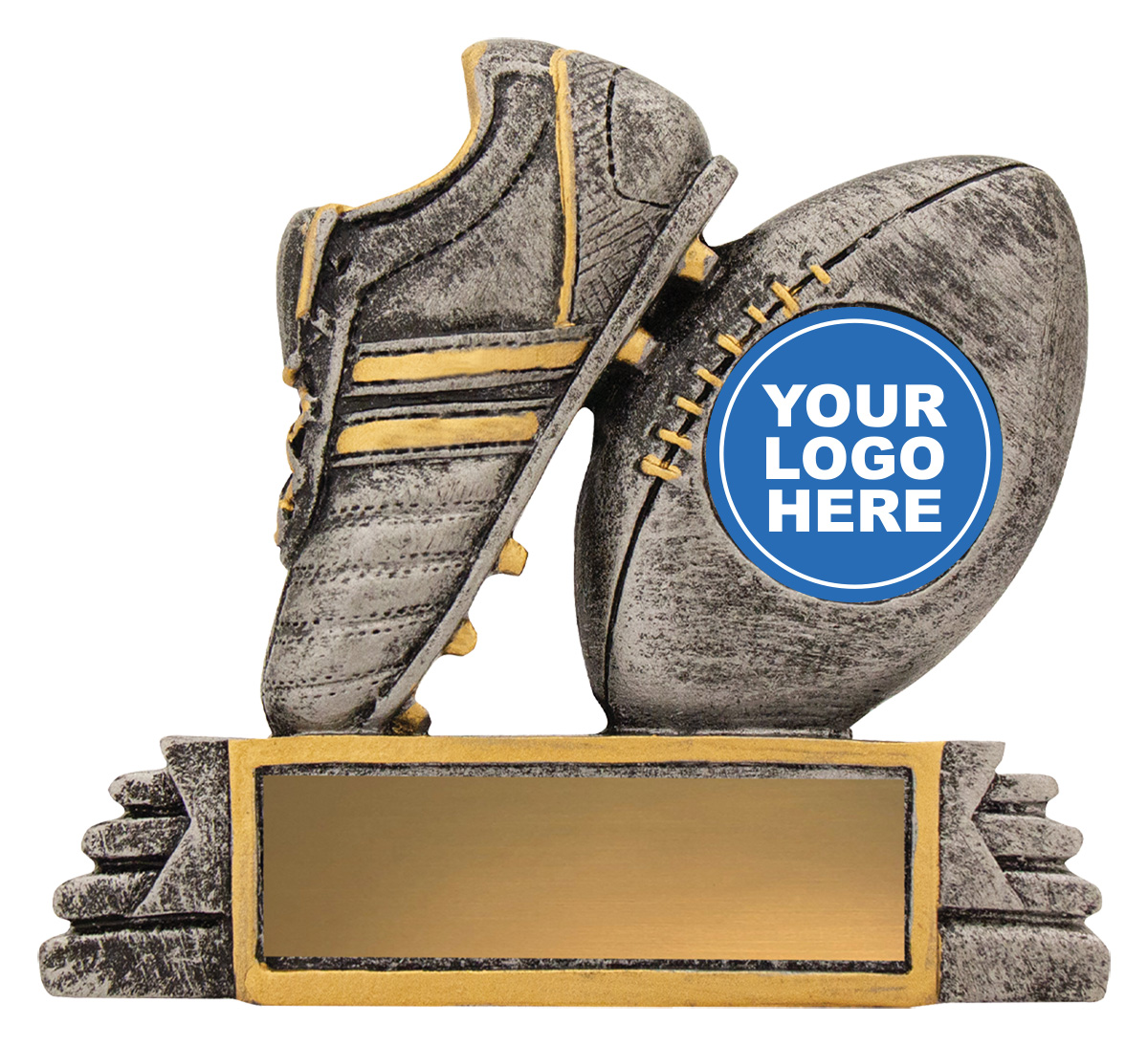 This silver and gold trophy recognises rugby excellence with a refined design featuring a rugby boot and ball set against goal posts. Crafted from high quality resin with a professional glazed finish, it offers a distinguished look and enduring durability. A dedicated 25mm centre allows for personalised touches, making it an ideal choice for rugby trophies.