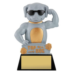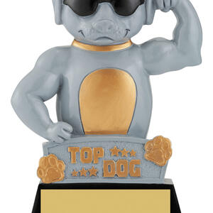 Celebrate confidence and charm with this Top Dog resin trophy. Featuring a flexing dog in sunglasses, its a playful award for office stars, sports teams, or anyone whos earned top status.
