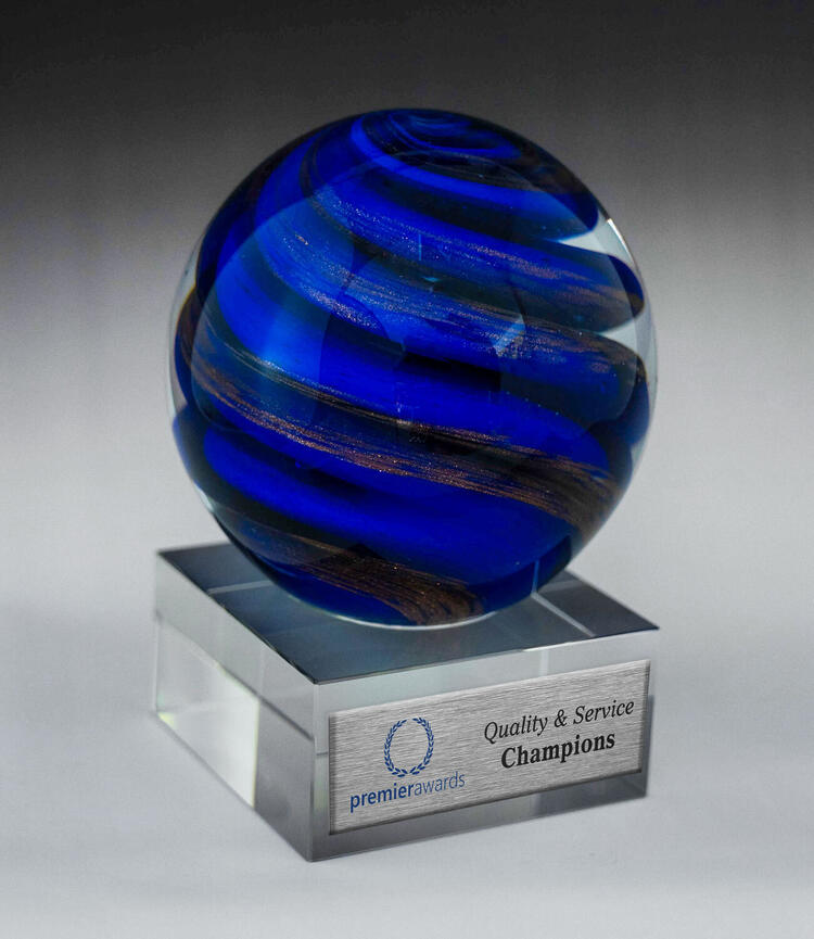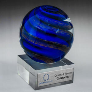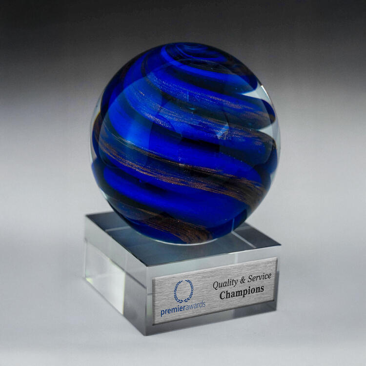 This glass award piece captivates with an elegant spherical design. Raised on a square base, it offers a luminous display that makes a memorable award for employees. Crafted for significance and distinction, it is an artistic choice for marking exceptional achievement.
