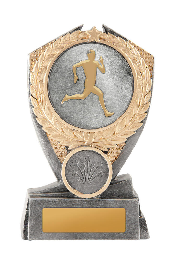 This silver and gold resin life saving trophy features a raised runner figure framed by a detailed laurel wreath and star accent. With a textured silver backdrop and gold trim, itÂ’s a stylish choice for all awards.