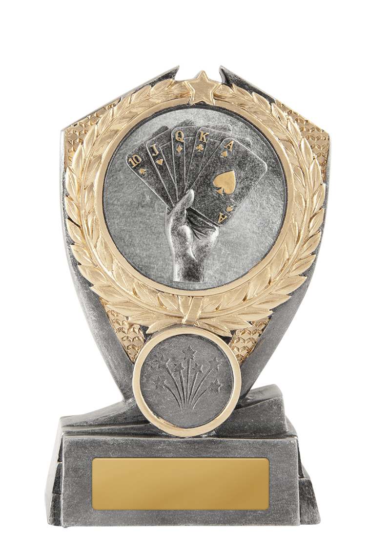 This poker tournament trophy stands out with its detailed depiction of a hand holding a royal flush in spades, framed by an elegant laurel wreath. Crafted from resin, it features striking gold and silver tones that convey a sense of achievement. The circular emblem and rectangular base create a professional finish, making it a trusted option for recognising excellence in card games.
