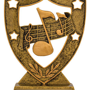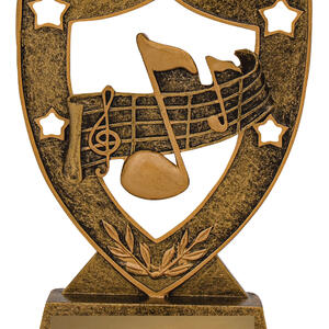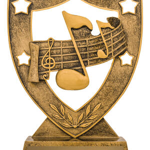 Celebrate musical achievement with this elegantly crafted music trophy, featuring a distinctive shield design adorned with raised musical notes and a treble clef. The gold finish highlights its unique three dimensional form, making it a standout choice for music competitions and band recognition.