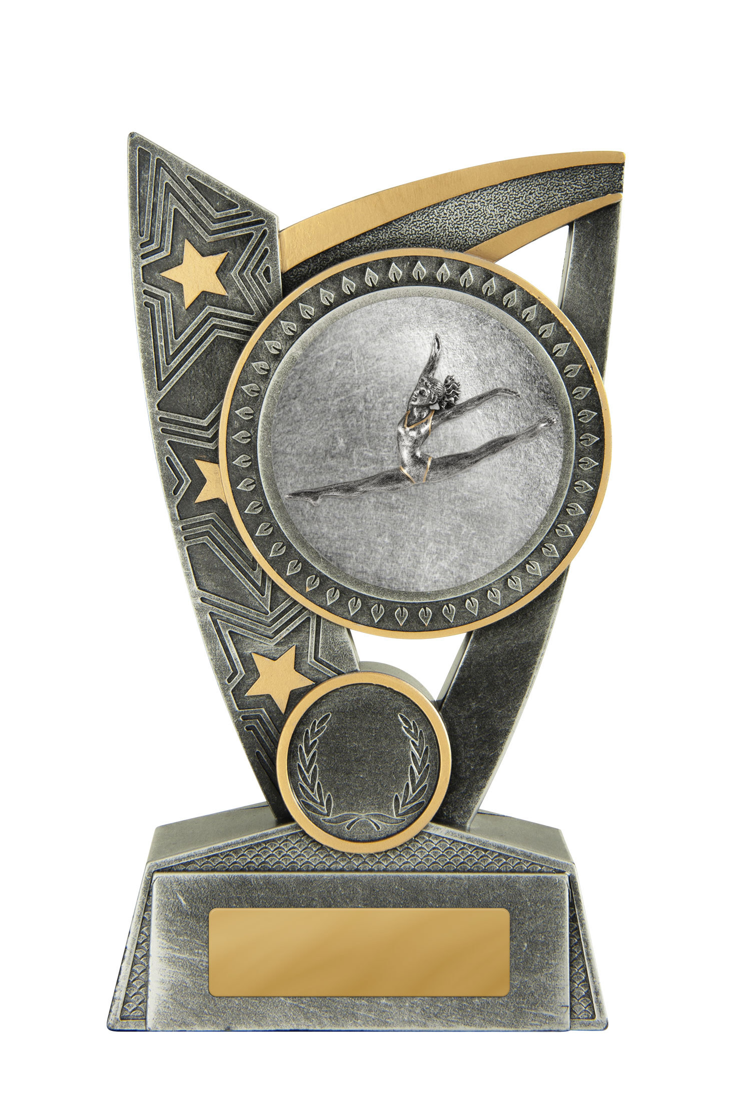 Celebrate gymnastics achievement with a contemporary trophy crafted in gold, silver, and black tones. Featuring an abstract design, this award highlights a gymnast in mid leap, surrounded by decorative stars and a bold circular centrepiece. It offers reliable durability and the option for a trophy with engraving, making each award truly personal and memorable.