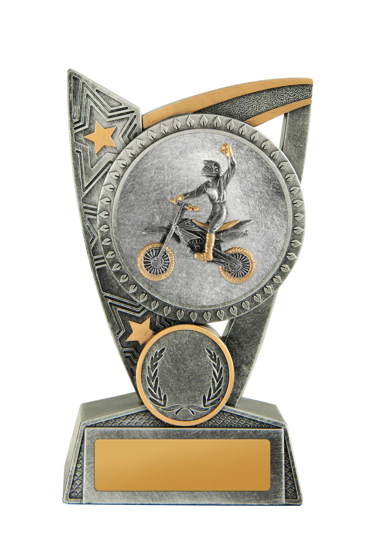 Celebrate achievement in motor sports with this motocross trophy, crafted with a striking silver and gold finish and a dynamic star themed design. A circular centrepiece showcases a detailed motocross rider in action, capturing the spirit of competition. This award offers a memorable way to recognise outstanding performance on the track.