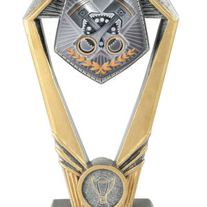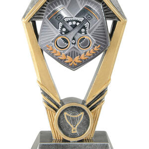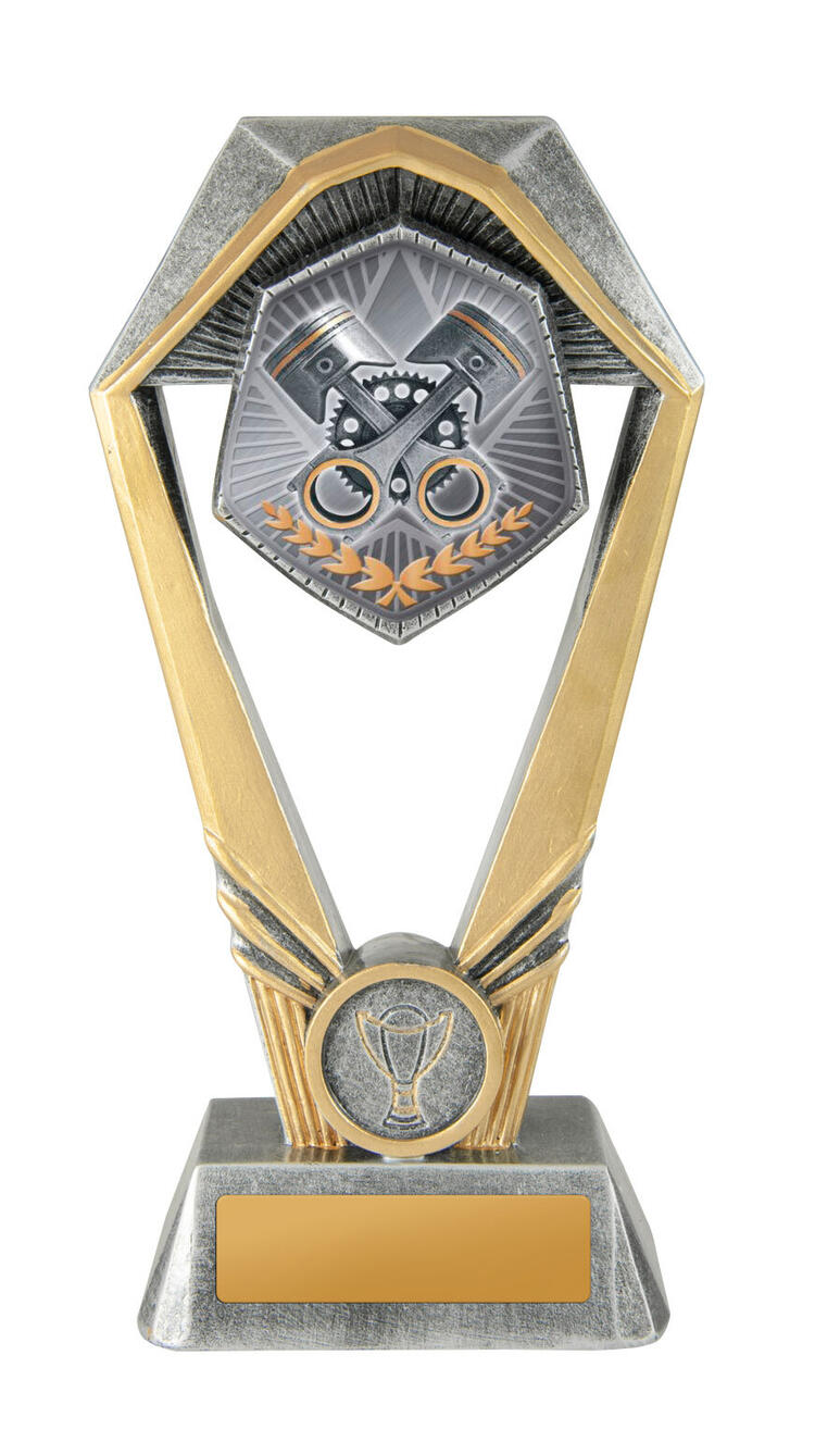 A contemporary choice among motorsport trophies, this award stands out with its hexagonal top and rectangular base, finished in gold and silver tones. The prominent crossed pistons and gears motif underscores achievement in automotive and mechanical arenas.