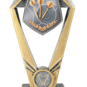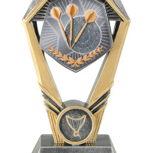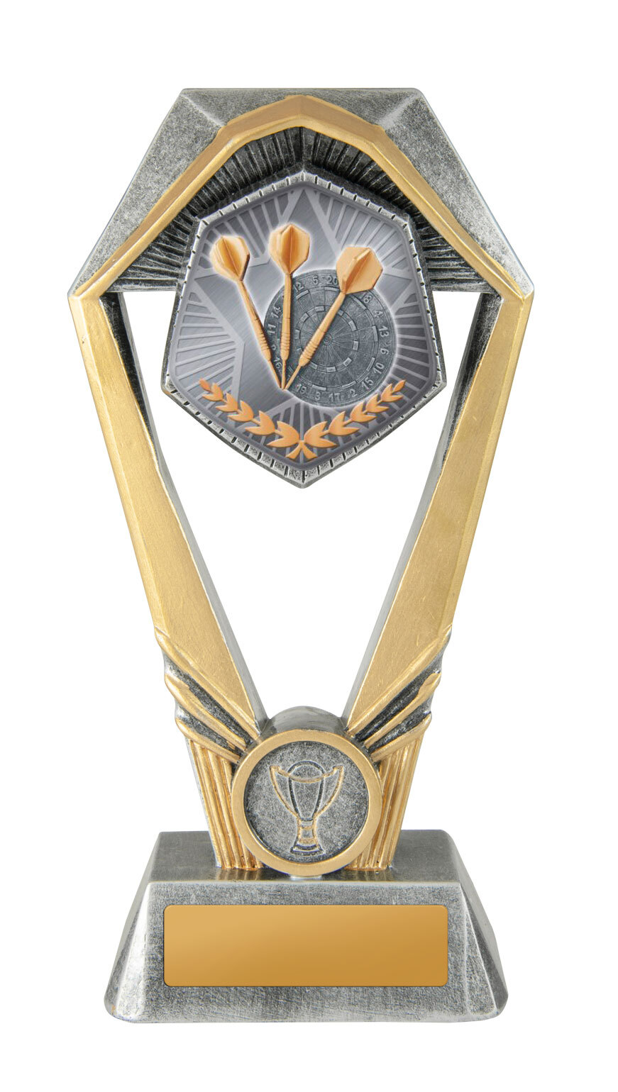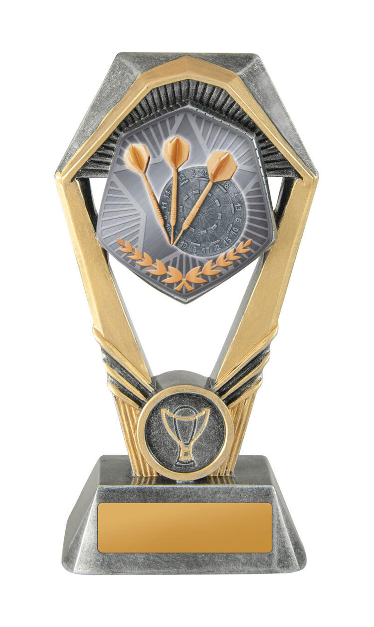 This darts trophy features a distinctive hexagonal top with a detailed dartboard and darts design, set above a rectangular base. Crafted from resin in elegant gold and silver tones, it creates a professional and memorable impression. The laurel wreath motif celebrates achievement, while the blank plaque allows for personalisation, making it ideal for darts events and competitions.