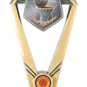 This refined basketball trophy pairs contemporary design with classic sporting motifs, making it a standout choice among basketball trophies. The hexagonal top, adorned with a basketball, net, and laurel wreath, sits above a rectangular base in a striking gold and silver finish. Durable metal and plastic construction ensures longevity, while the base allows for personalised engraving to commemorate individual or team achievement.
