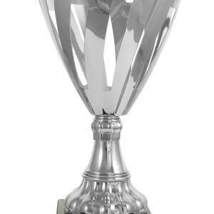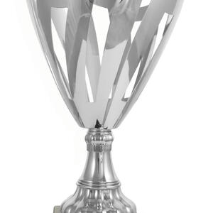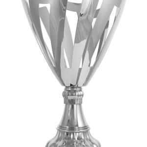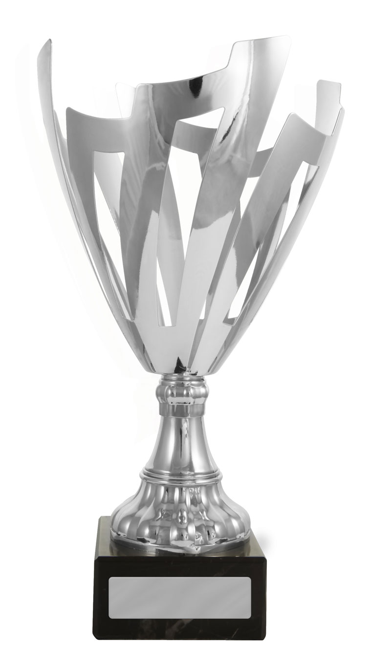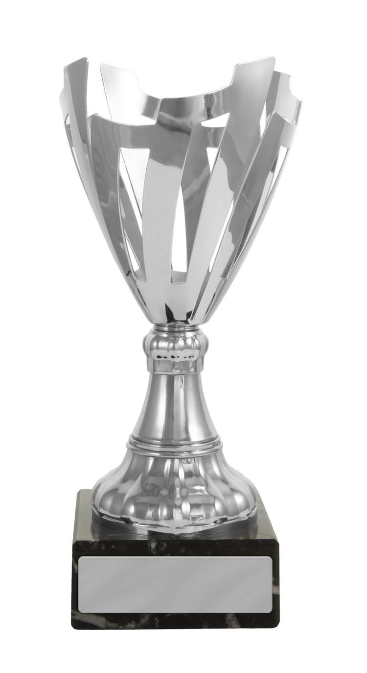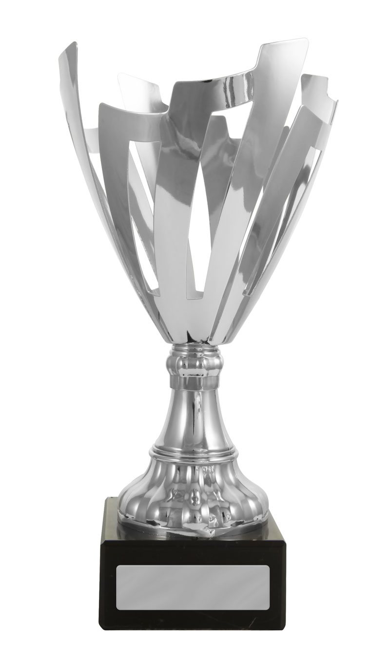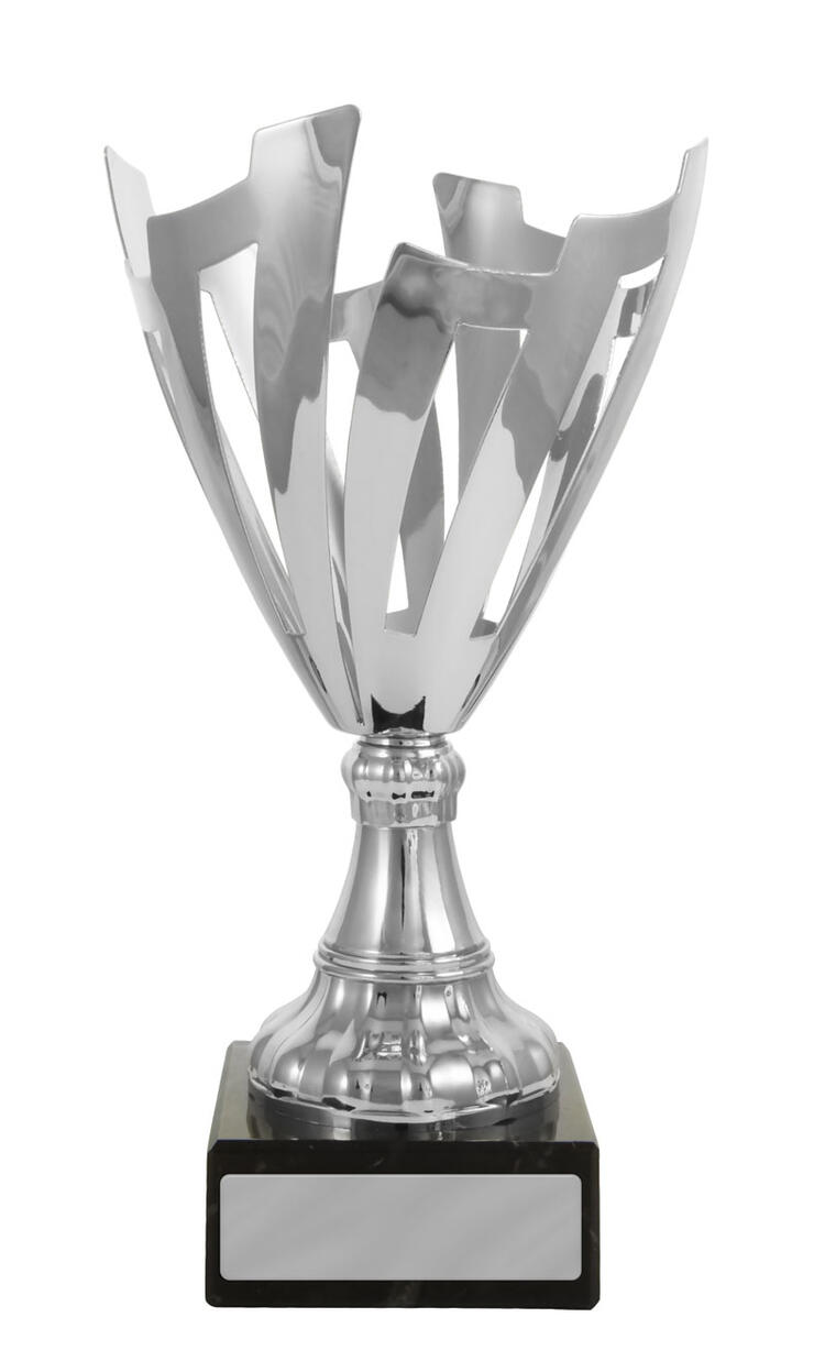 A contemporary silver trophy cup with a striking flared top, this award features precision crafted cut out patterns and a sturdy rectangular base. The interplay of refined silver metal and deep black accents gives it a professional, elegant presence. A trusted choice for recognising achievement in corporate, academic, or community settings where quality and modern design are valued.