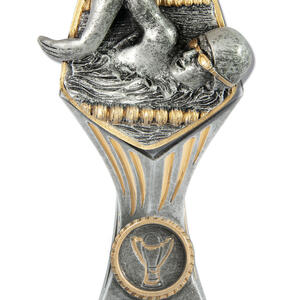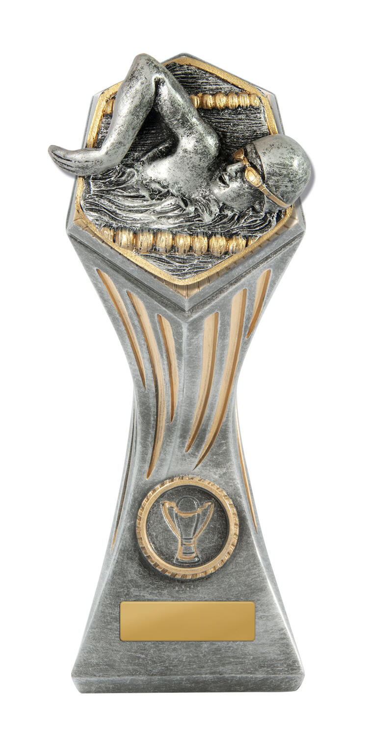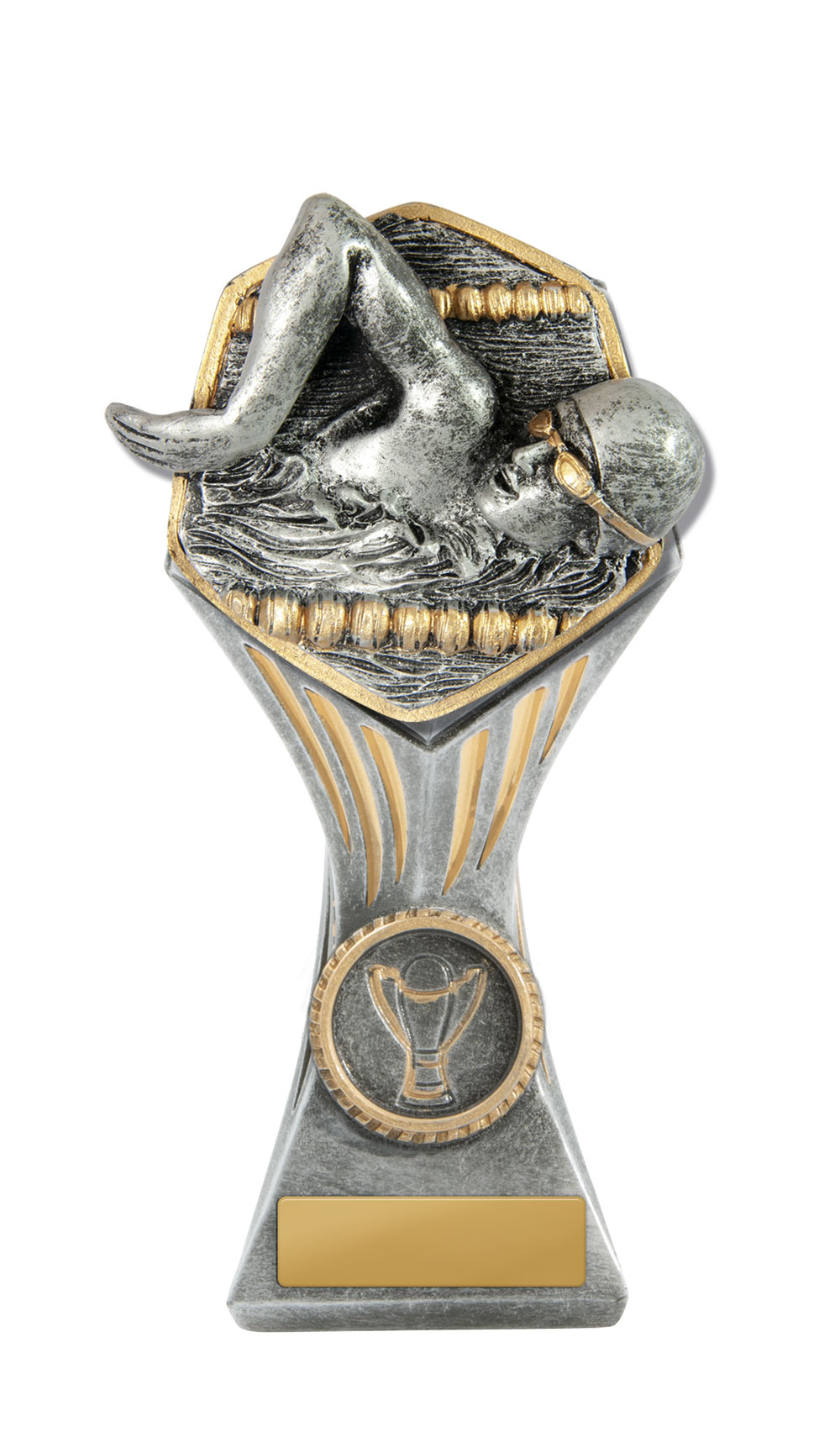 This swimming trophy features a dynamic male swimmer in a backstroke position, elegantly finished in silver and gold tones. Crafted from durable resin, it stands on a decorative base that leaves space for personalisation. Designed to recognise achievement in swimming, this award adds a refined touch to any event or presentation.