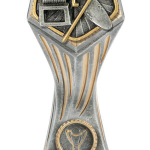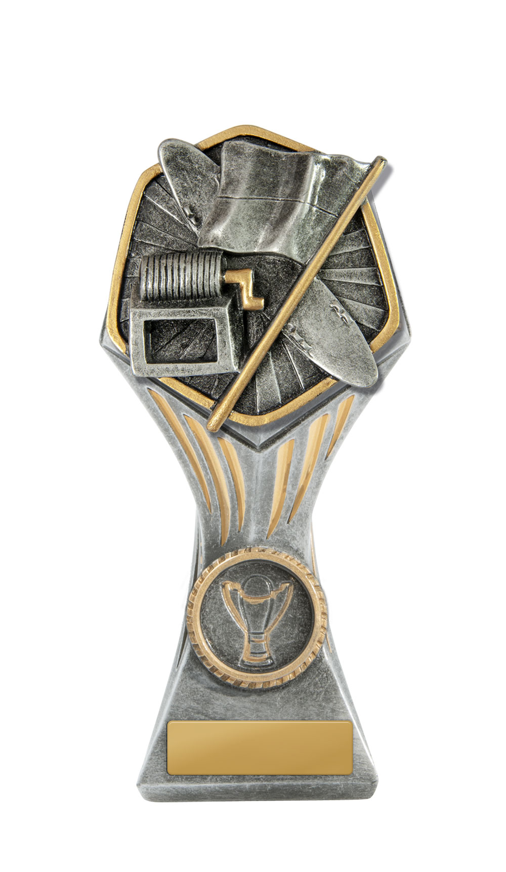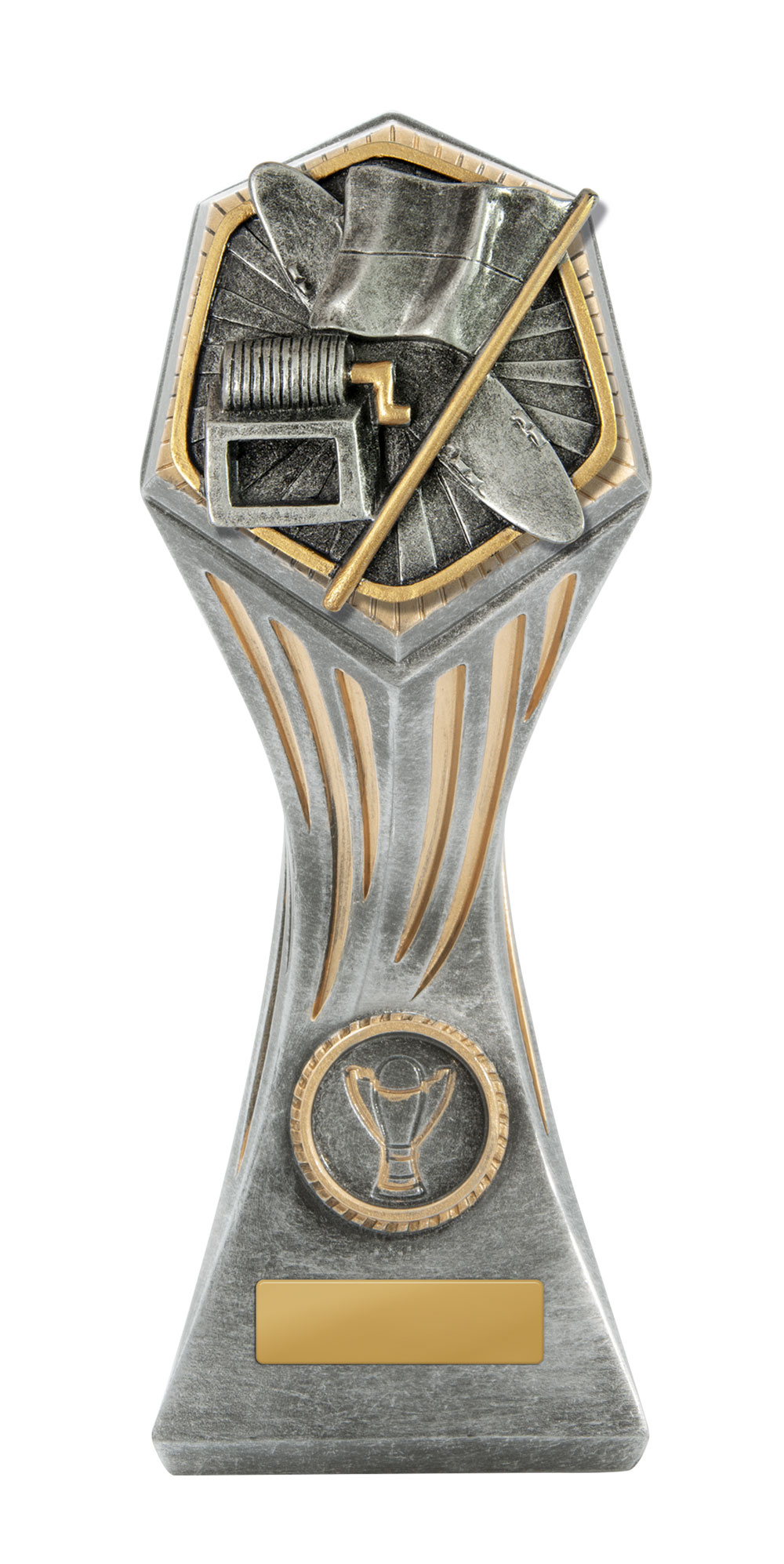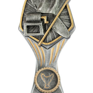 This trophy cup stands out with its flared, asymmetrical design and bold checkered pattern, instantly capturing attention at any awards ceremony. It is available in a wide range of colours, including gold, red, green, blue, pink, and black. The prominent circular emblem area offers customisation, making this award cup a reliable choice for recognising achievement in any sporting event.