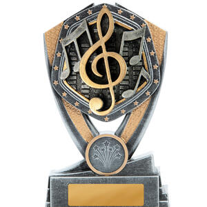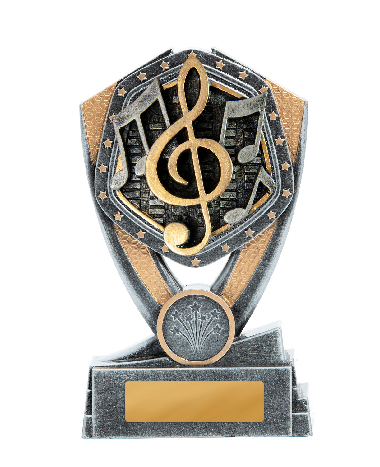 Designed for dance awards, this contemporary trophy cup presents a dynamic conical silhouette with decorative cutouts and prominent star motifs. The metallic upper section, available in vibrant blue, green, gold, and pink, is paired with a black base for a refined finish. Offering personalisation, it is an ideal choice for recognising dance achievement in a memorable and professional way.