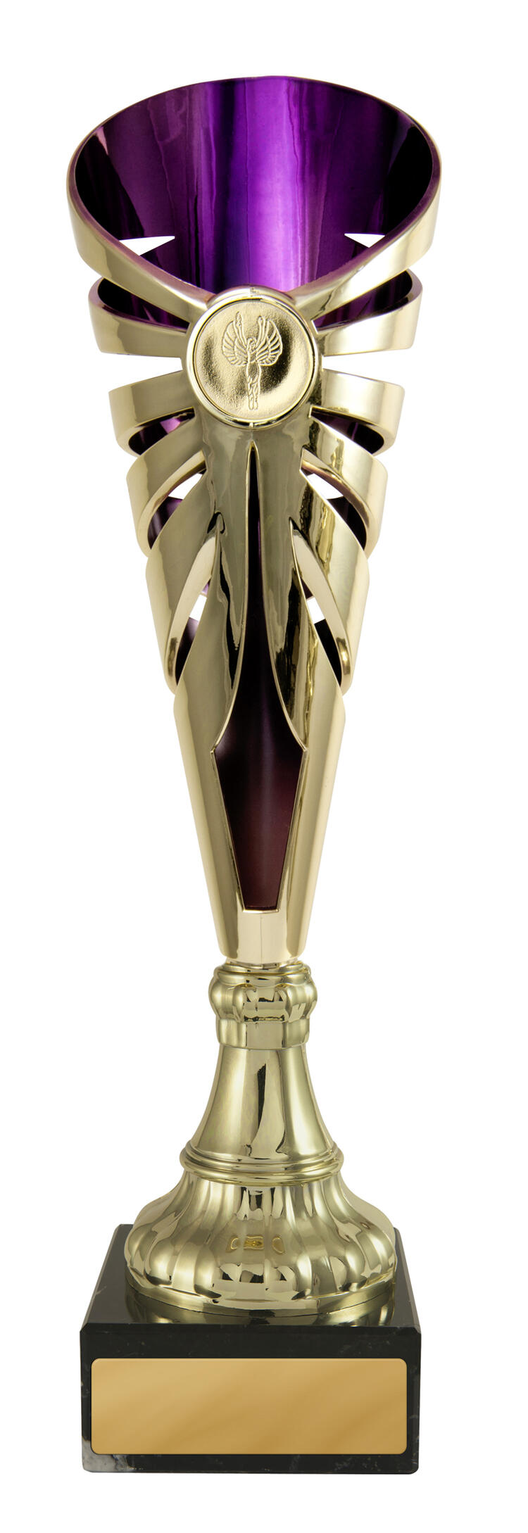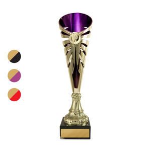 Featuring a refined conical silhouette with decorative cutouts, these dance cups offer an elegant choice for a variety of recognition needs. The metallic finish is complemented by vivid accent colours including gold, black, red, green, blue, silver, and pink, all supported by a durable base. Crafted from plastic, each trophy cup is designed for lasting presentation and features a 25mm centre for customisation with laser engraved detailing, making it suitable for commemorating achievement in any field.