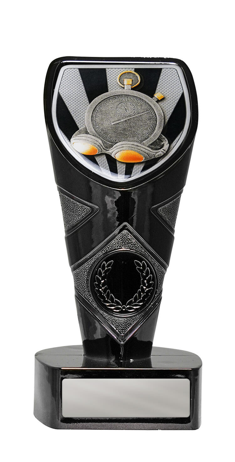 This contemporary trophy is crafted for swimming recognition, combining black and silver finishes for a refined and memorable presentation. The shield shaped top features a stopwatch and goggle design, capturing the essence of competitive swimming, while a laurel wreath emblem at the base signifies achievement.