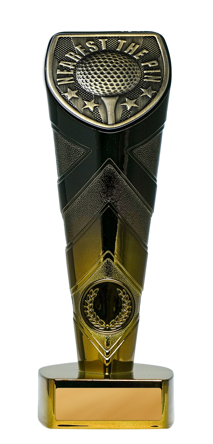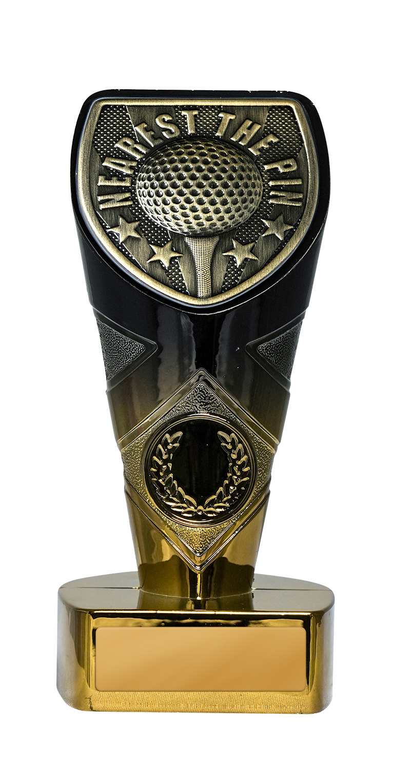 Showcasing a dynamic shield shaped top with a bold golf ball motif, this trophy is a refined choice for “Nearest the Pin” recognition. Finished in rich gold and black tones. Available in multiple sizes, each piece can be personalised with engraving, making it an ideal addition to any collection of golf trophies.