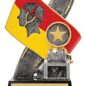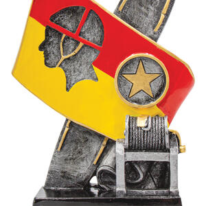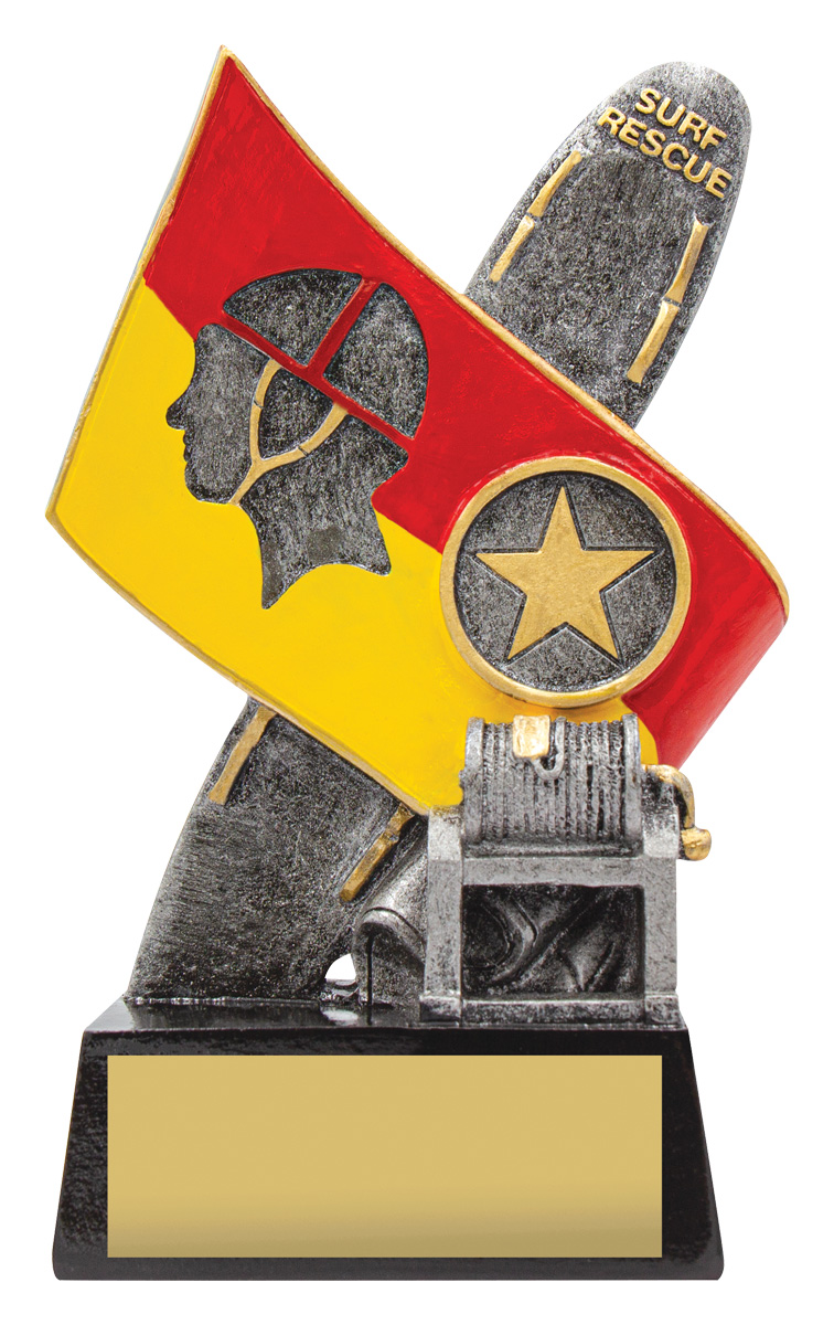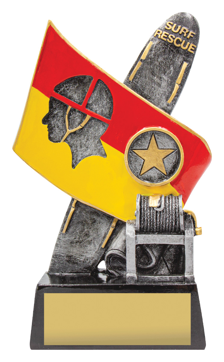 This surf life saving trophy features a striking surfboard and flag motif, honouring dedication and skill in surf rescue. The resin construction, finished in bold red, yellow, gold, black, and silver, creates a lasting impression for any ceremony. With its lifeguard silhouette and star emblem, this trophy is crafted to recognise achievement in the surf life saving community.