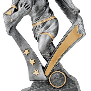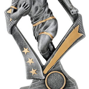 Celebrate rugby achievement with this striking rubgy trophy, crafted in sophisticated silver and gold tones. Featuring a dynamic female player in a running pose with a star themed design, it captures the spirit and drive of the game. The robust metallic construction and elegant motifs make it a memorable choice for honouring dedication on the field.