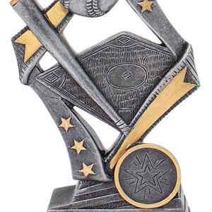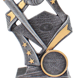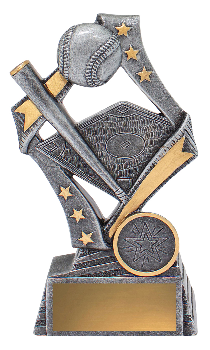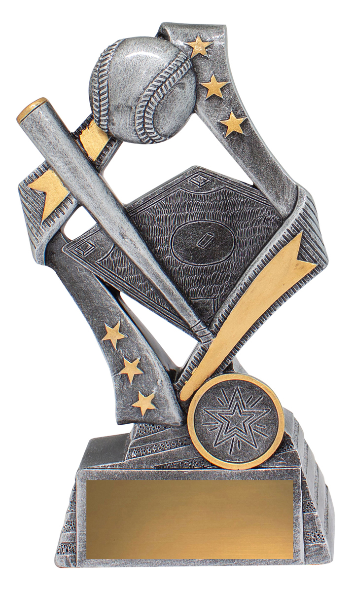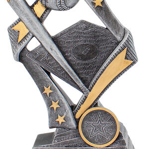 Celebrate sporting achievement with this striking baseball trophy, crafted in a refined silver and gold metallic finish. The dynamic design features a baseball, bat, and field, highlighted by elegant star accents for a memorable presentation. Ideal for recognising excellence in baseball or softball, this award is both durable and visually impressive.
