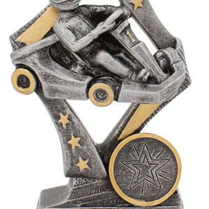 Celebrate motorsport achievement with this go kart trophy, crafted in striking silver and gold tones. Featuring a go kart racer in motion, complemented by star detailing and a sleek metallic finish, this award brings energy and sophistication to any racing event, making it a lasting symbol of accomplishment on the track.