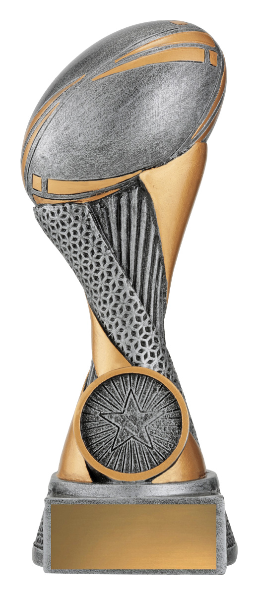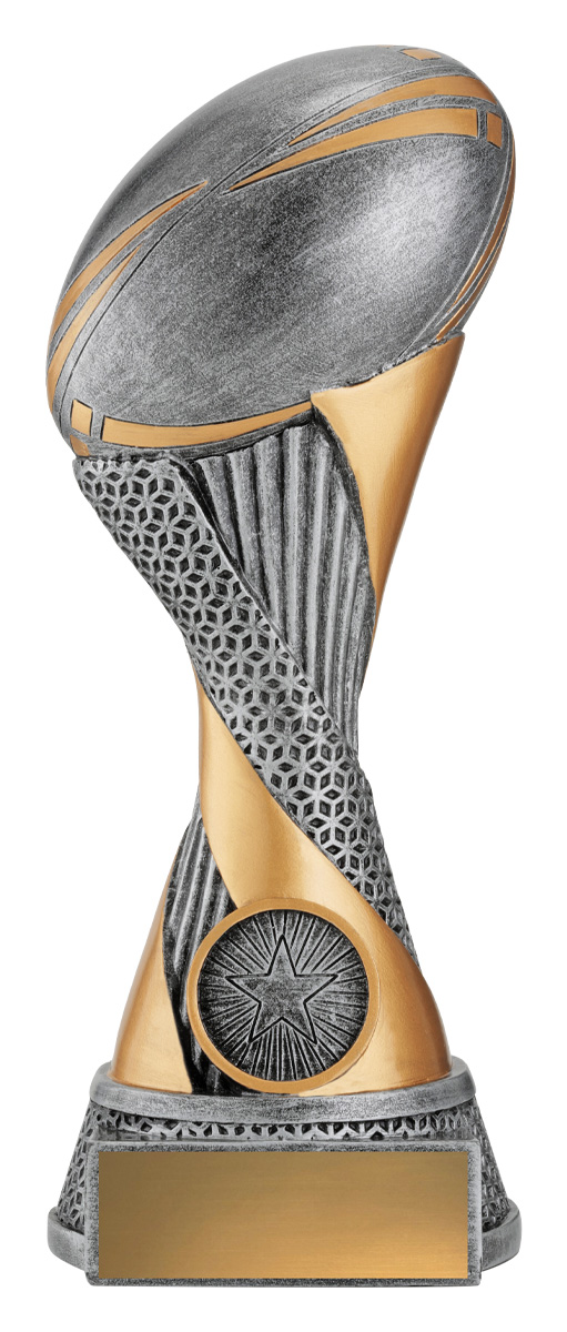 Celebrate achievement on the field with a rubgy trophy designed for lasting recognition. This silver and gold award features a striking football motif, a bold star emblem, and a textured base, blending elegance with modern design. Crafted from durable resin, it marks every rugby accomplishment with style and quality.
