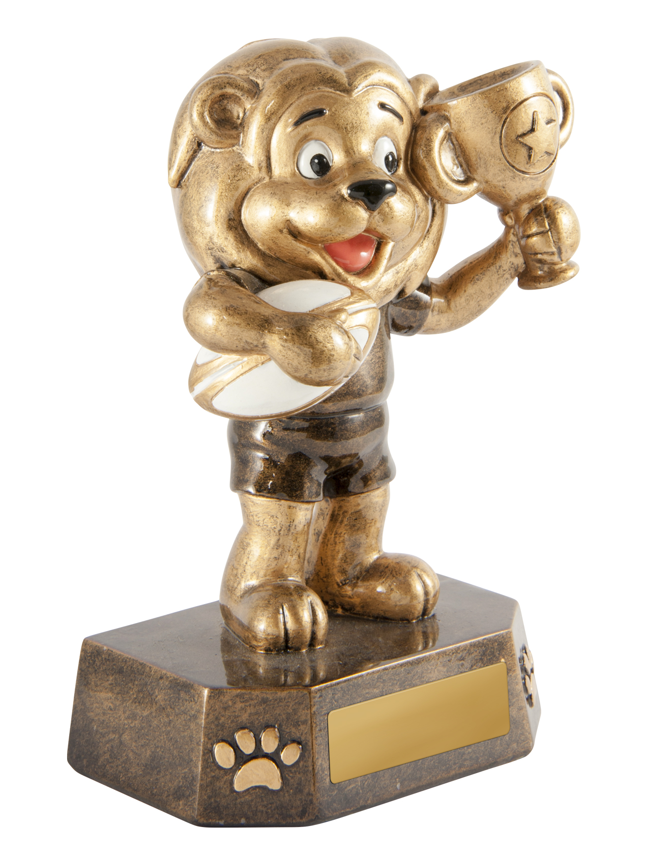 This rugby trophy captures the spirit of achievement with a gold toned lion character proudly holding a rugby ball and winner's cup. Crafted from resin it features detailed black and white accents and rests on a base with a paw print design. Ideal among sports award trophies.