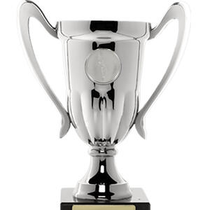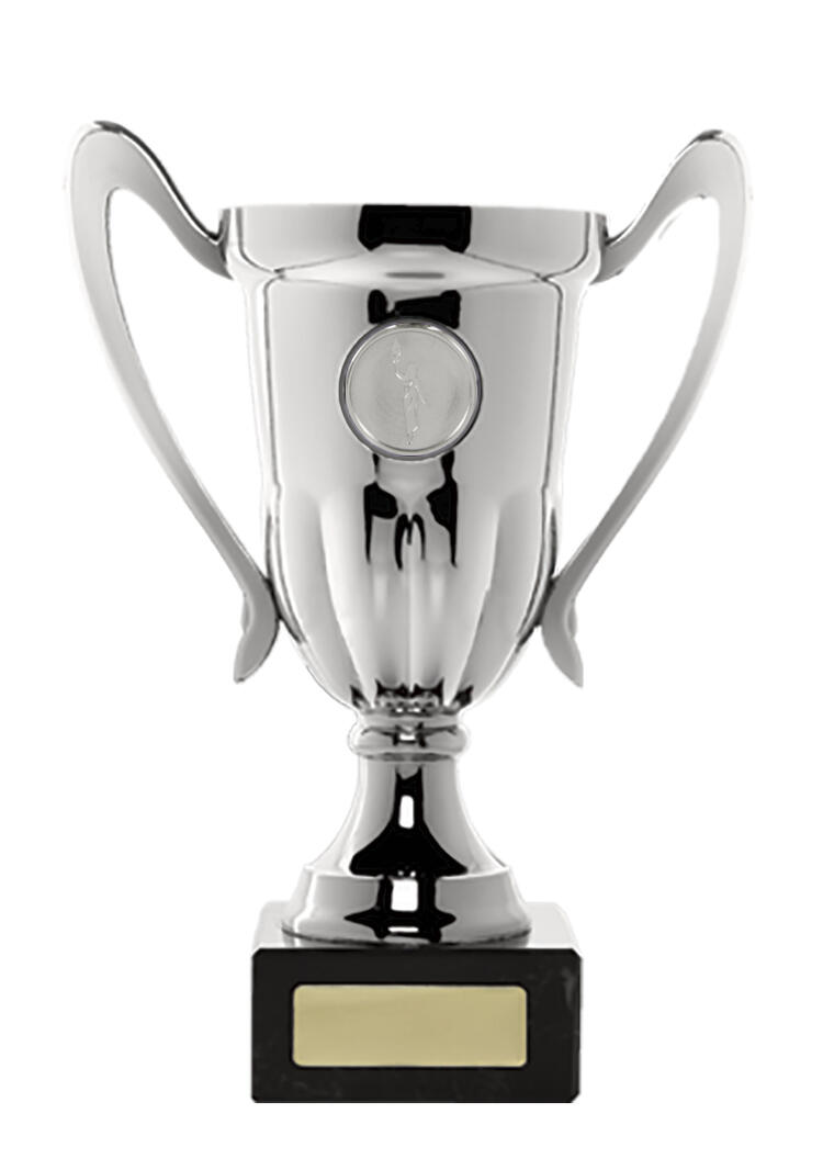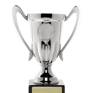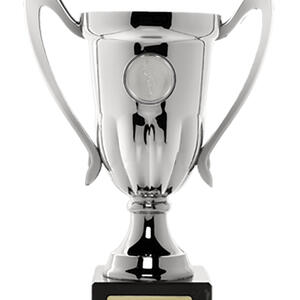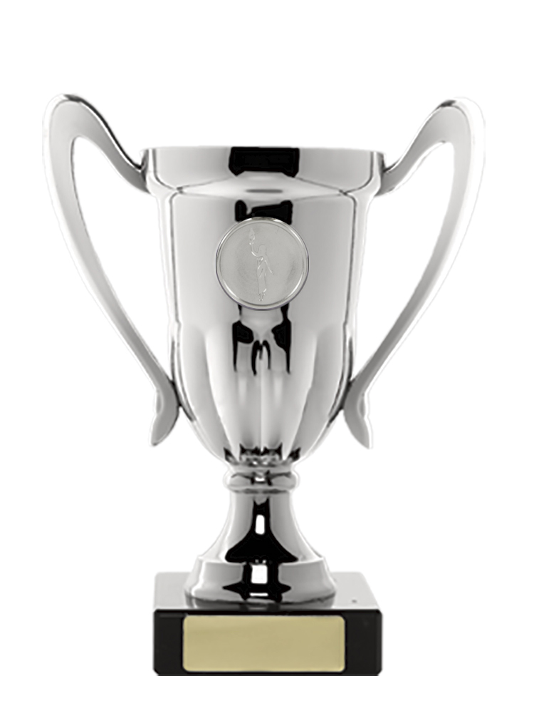 This silver trophy cup combines a classic silhouette with modern appeal, making it a versatile choice for all sporting recognition. Its silver finish, slender handles, and prominent circular emblem create a striking presentation, while the sturdy black base with a gold engraving plaque offers a refined foundation.
