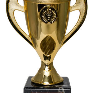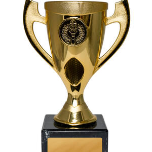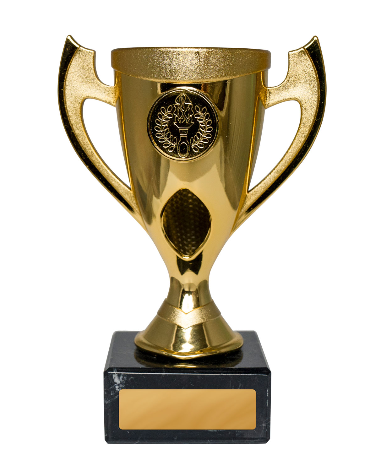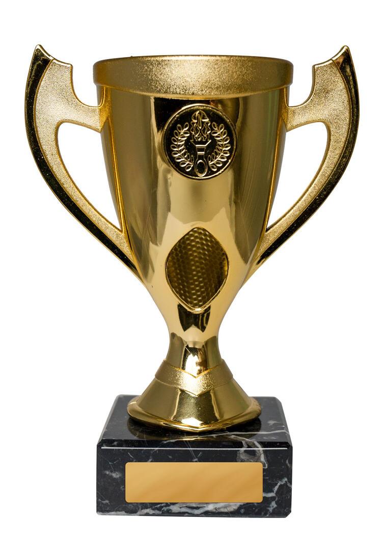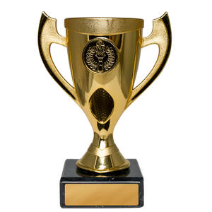 This gold trophy cup features a striking torch and laurel wreath emblem, making it a fitting choice for recognising achievement across any field. Crafted from plastoc with a sturdy base, it balances elegance and durability. The classic handles and refined detailing offer timeless appeal, while its customisable plaque area allows for personalised recognition.
