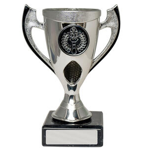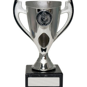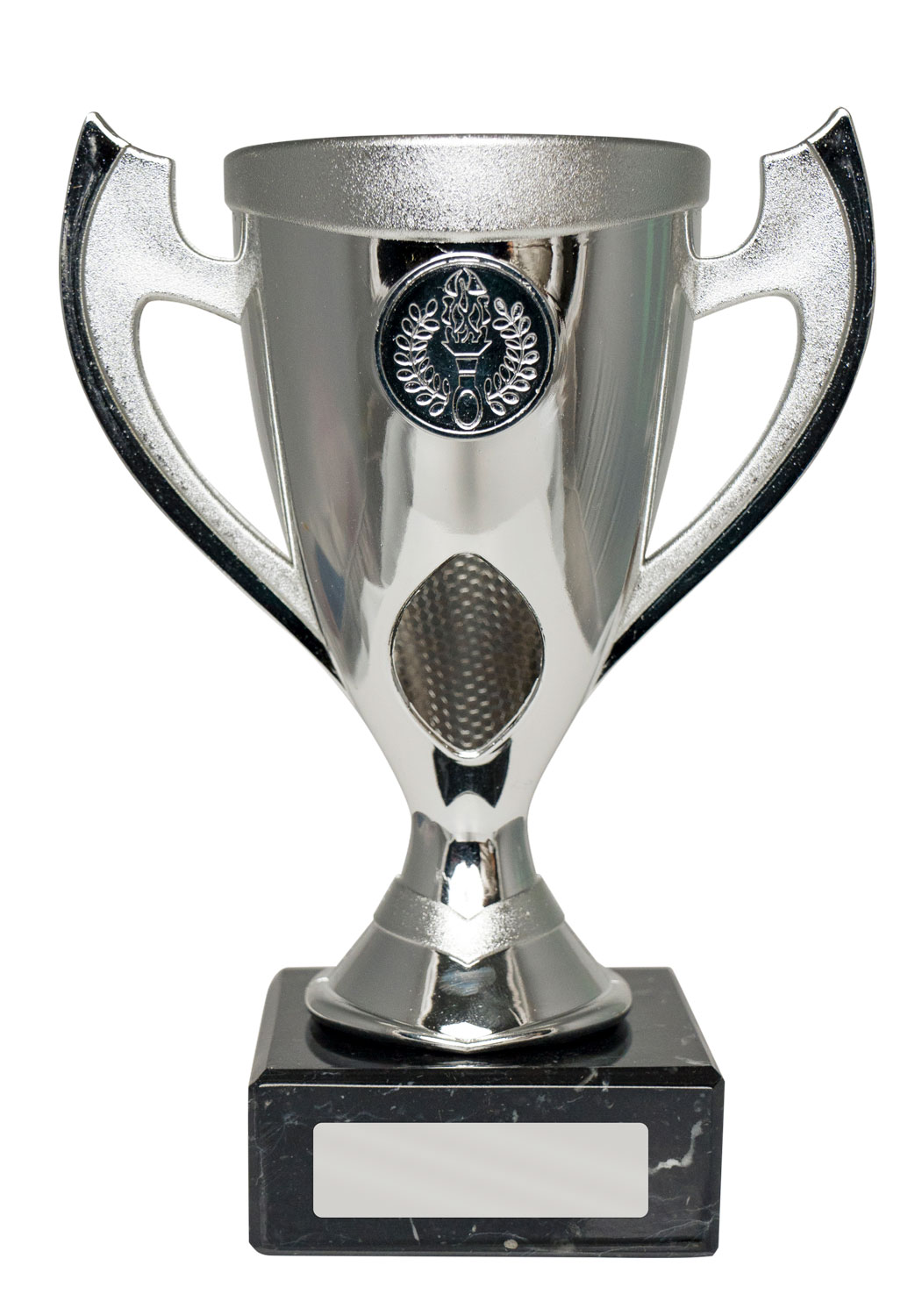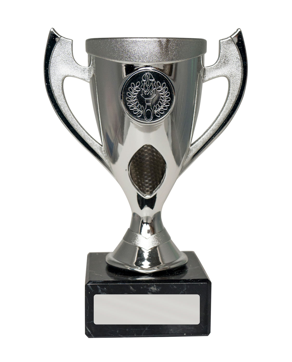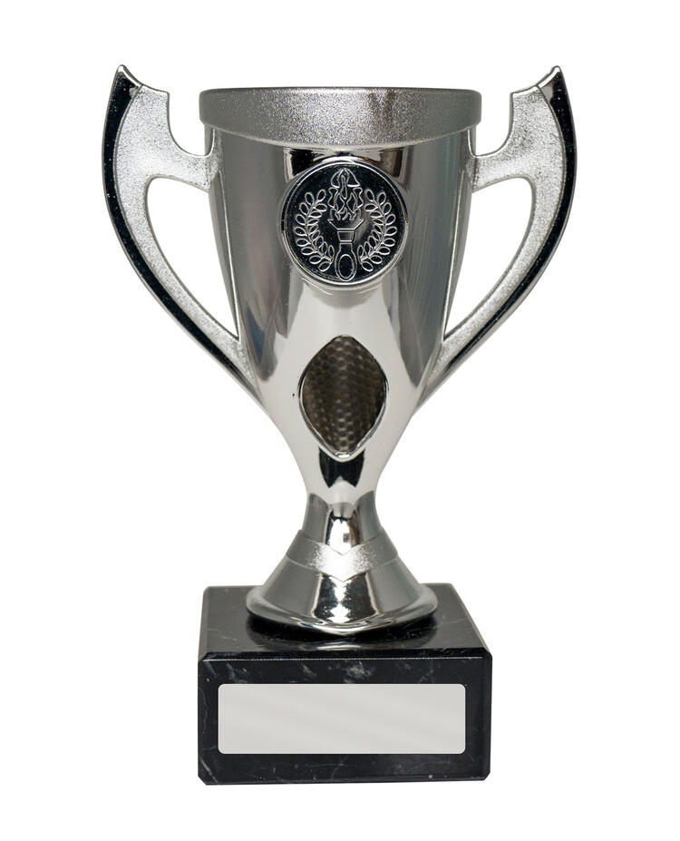 This plastic cup trophy from the budget cups range pairs a sleek silver finish with classic handles and a bold torch emblem, making it a versatile choice for recognising sports achievements. The trophy is crafted from plastic, set on a black marble base for a professional presentation. A blank engraving plate allows for personalisation, ensuring each achievement is memorable and distinct.