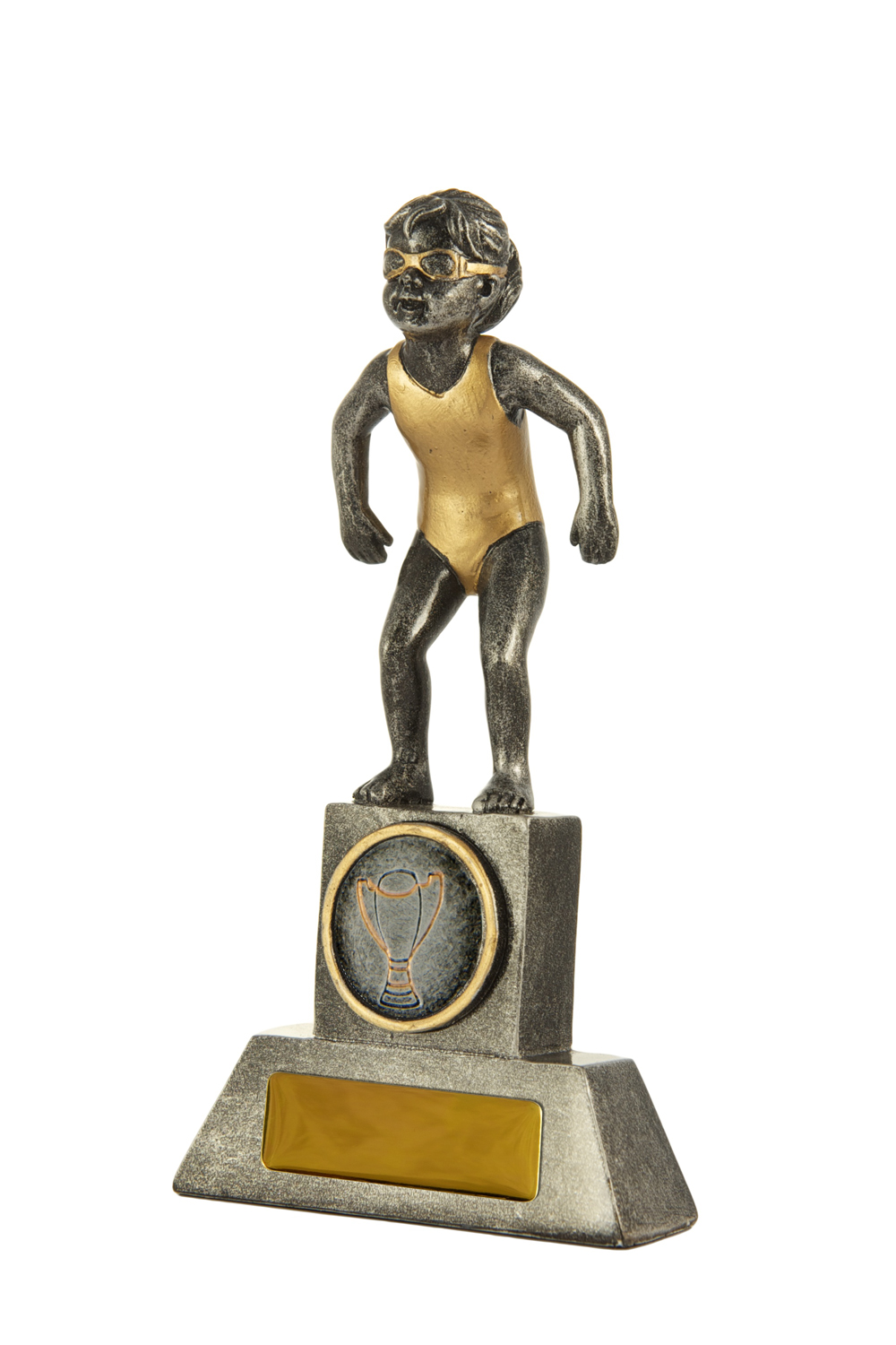 Celebrate swimming achievement with this elegant trophy, crafted to recognise promising female athletes. Featuring a swimmer in goggles and a swimsuit, the design captures the energy and precision of the sport. Each piece stands on a classic trophy base with a cup emblem, making it a standout among swimming trophies.