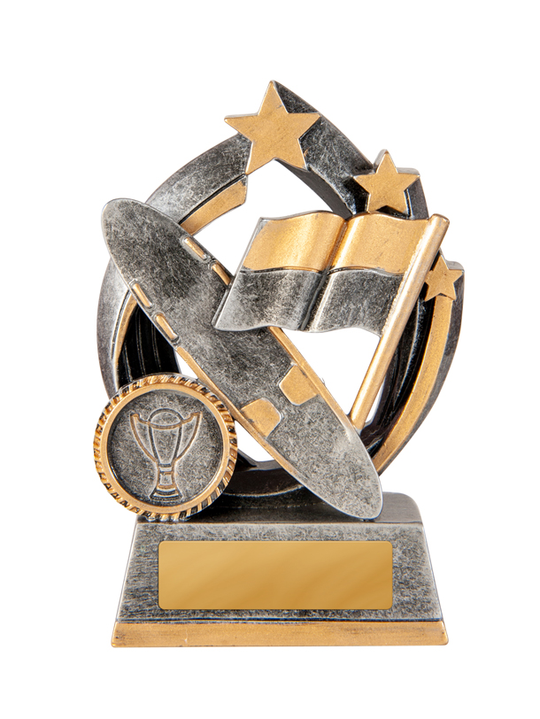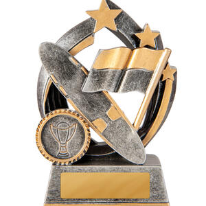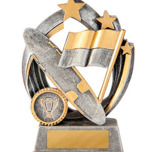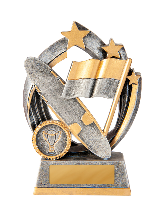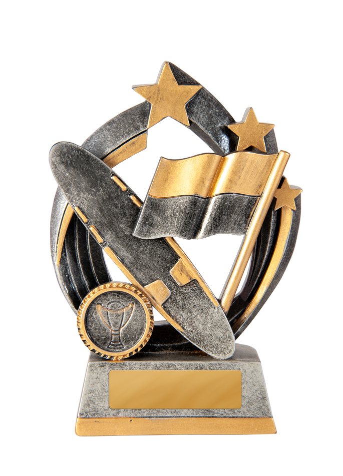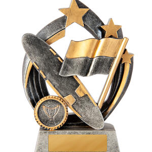 Celebrate achievement with this striking trophy, crafted in gold and silver and designed for surf lifesaving trophies and broader sports recognition. Featuring a sturdy circular base, dynamic racing flag, stars, and a trophy emblem, it seamlessly blends durability with an elegant finish.