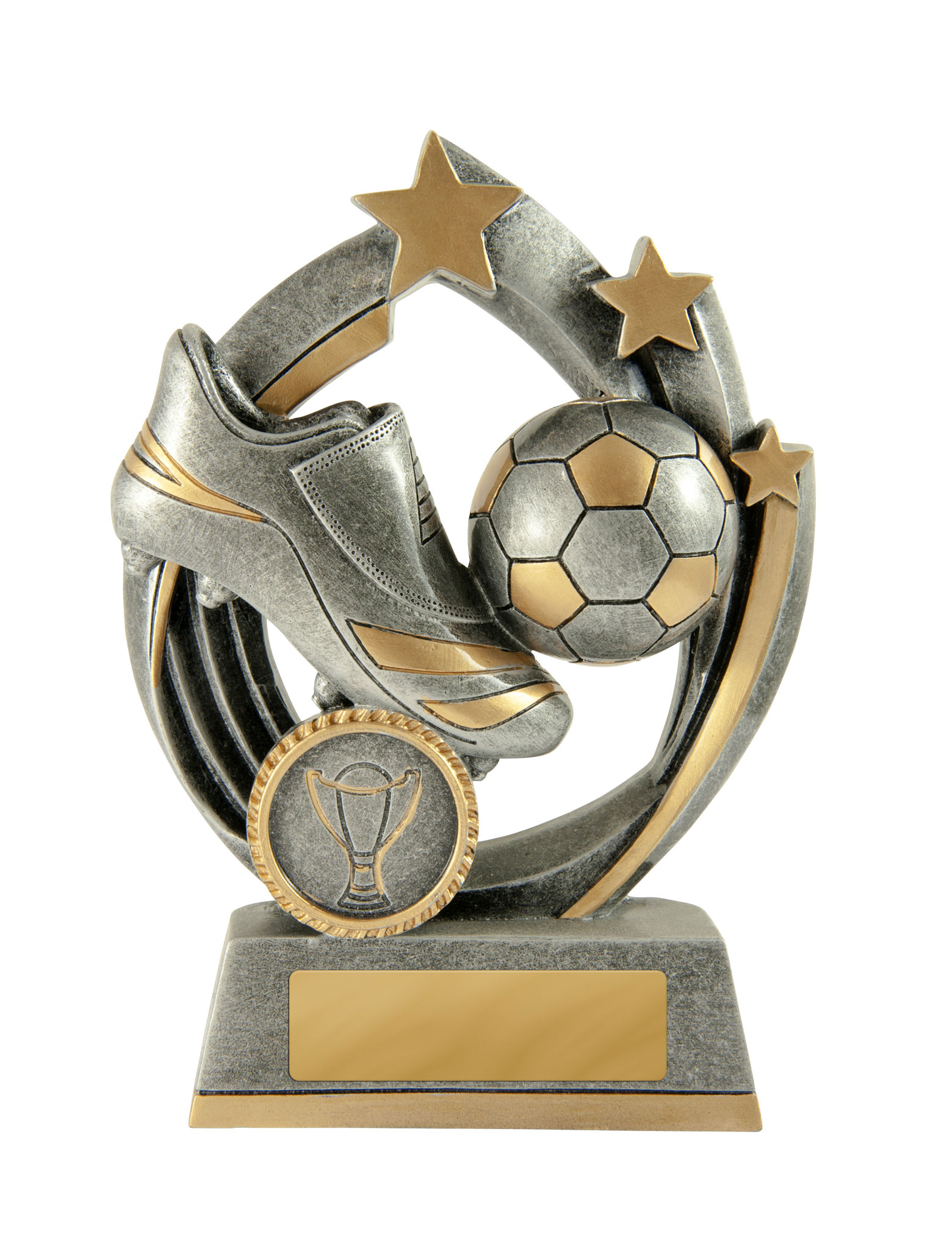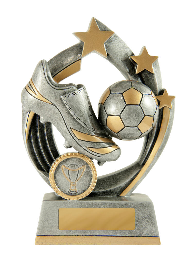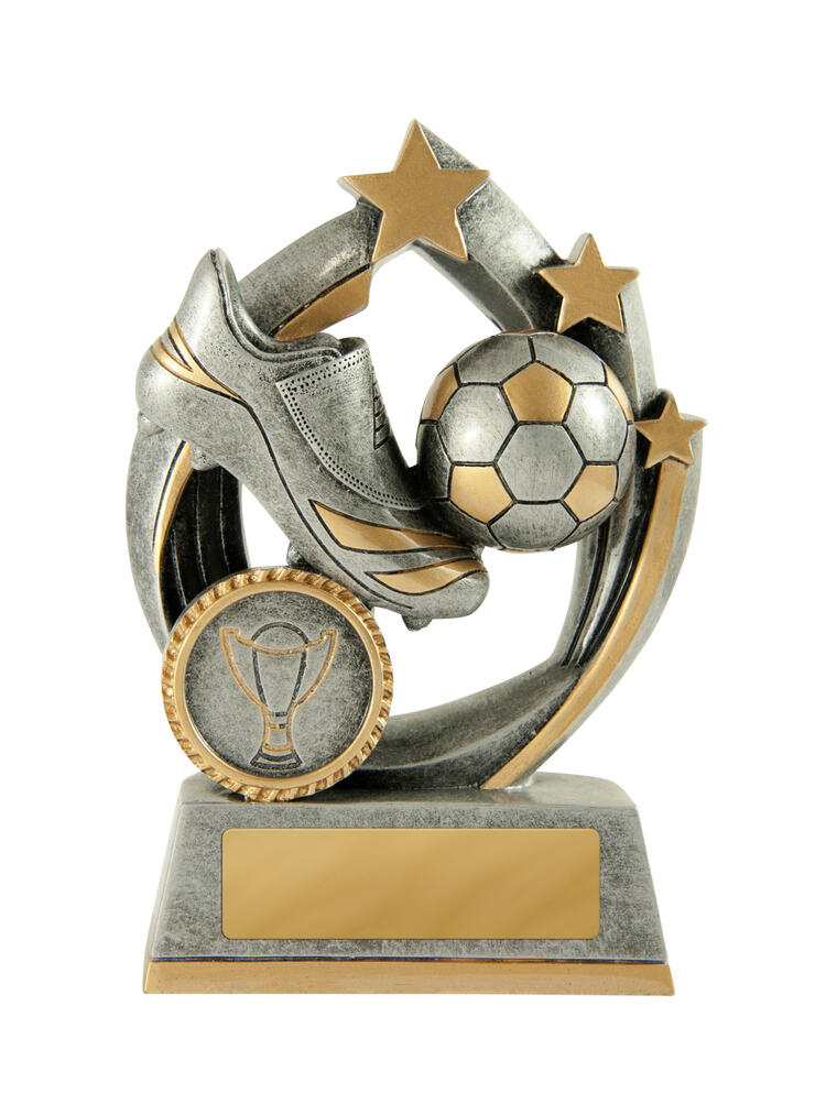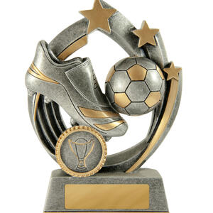 Celebrate football achievement with a trophy crafted to inspire. This football trophy features a striking football and boot motif in gold and silver, set atop a sturdy black marble base. Durable metallised plastic and a gold accented personalisation plate, make this soccer trophy an elegant and memorable choice for player or team recognition.