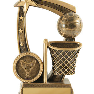 This netball trophy features a striking 3D design with a netball and hoop, accentuated by star motifs and a classic trophy emblem. Crafted from resin with a rich metallic gold and bronze finish, it offers both visual impact and durability.