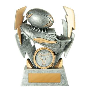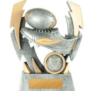 Celebrate rugby achievement with this elegant rugby trophy, featuring a dynamic design of a rugby ball, boot, and twin lightning strikes. Crafted from resin with an antique silver finish and refined gold accents, it offers a premium, weighted feel.