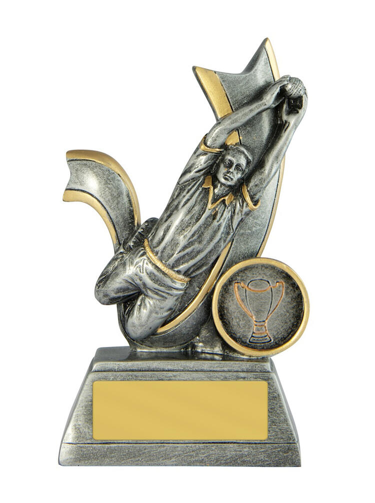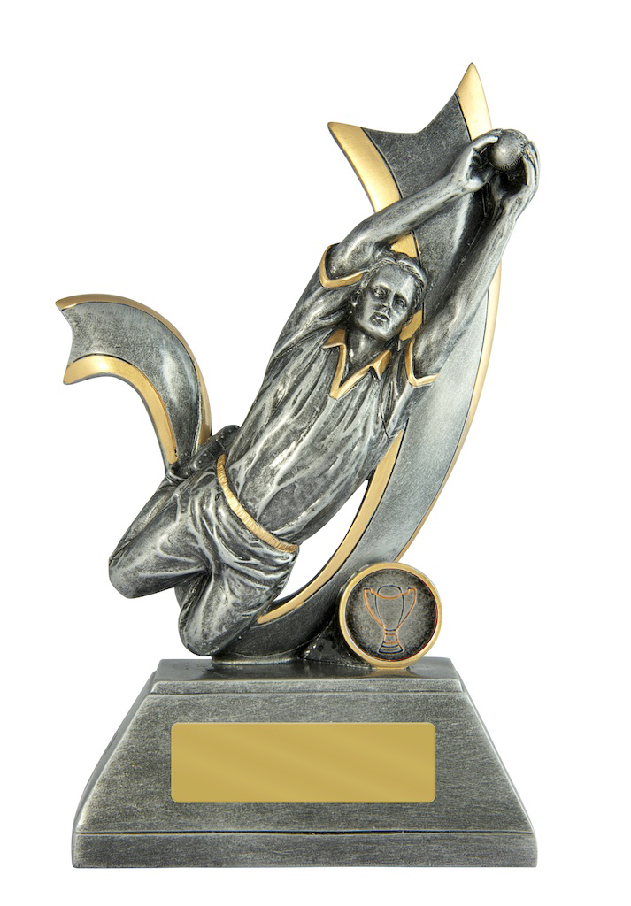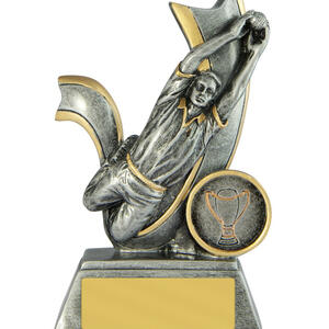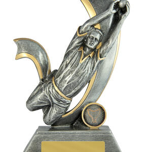 Designed to celebrate precision and skill, this cricket trophy features a striking fielder figure in full motion, expertly crafted in resin with a silver and gold finish. The dynamic pose captures the excitement of a game changing catch, set against an attractive background.