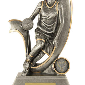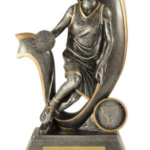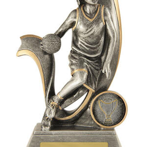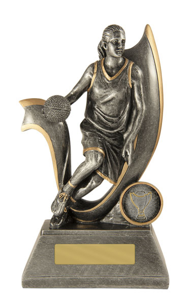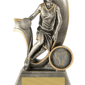 Celebrating skill and dedication, this Velocity trophy highlights a female basketball player captured in motion with a distinctive curved design. It features a basketball motif and trophy emblem, reflecting the spirit of the game. An excellent addition to basketball trophies collections for recognising achievement in clubs, schools, or competitions.