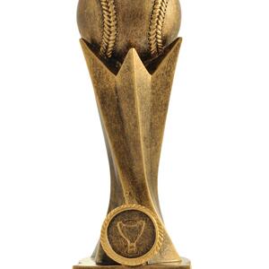 Celebrate sporting success with this impressive star themed trophy, showcasing a baseball glove, bat, and ball surrounded by golden stars. Crafted from resin and finished in antique tones. Includes engraving plate.